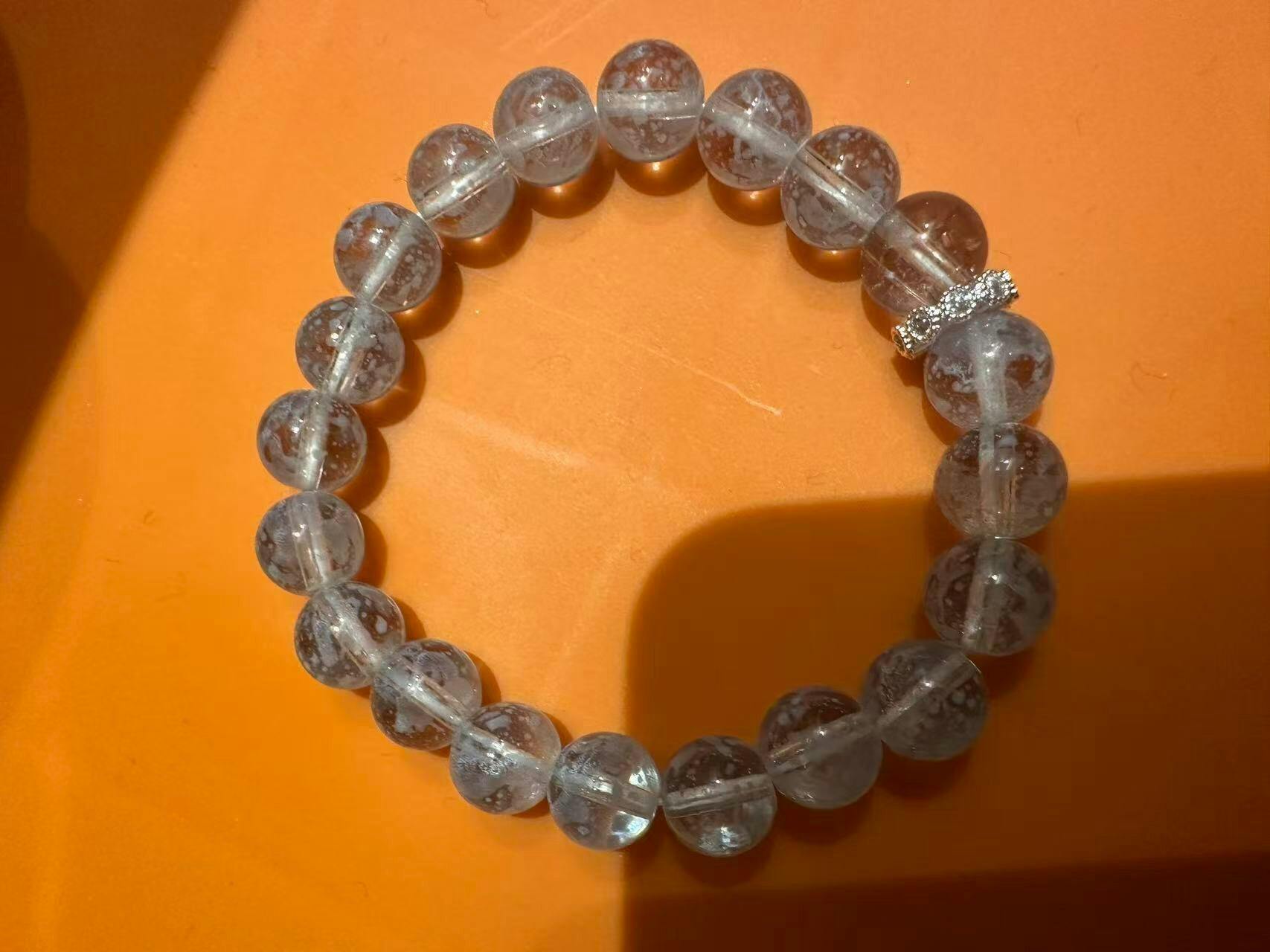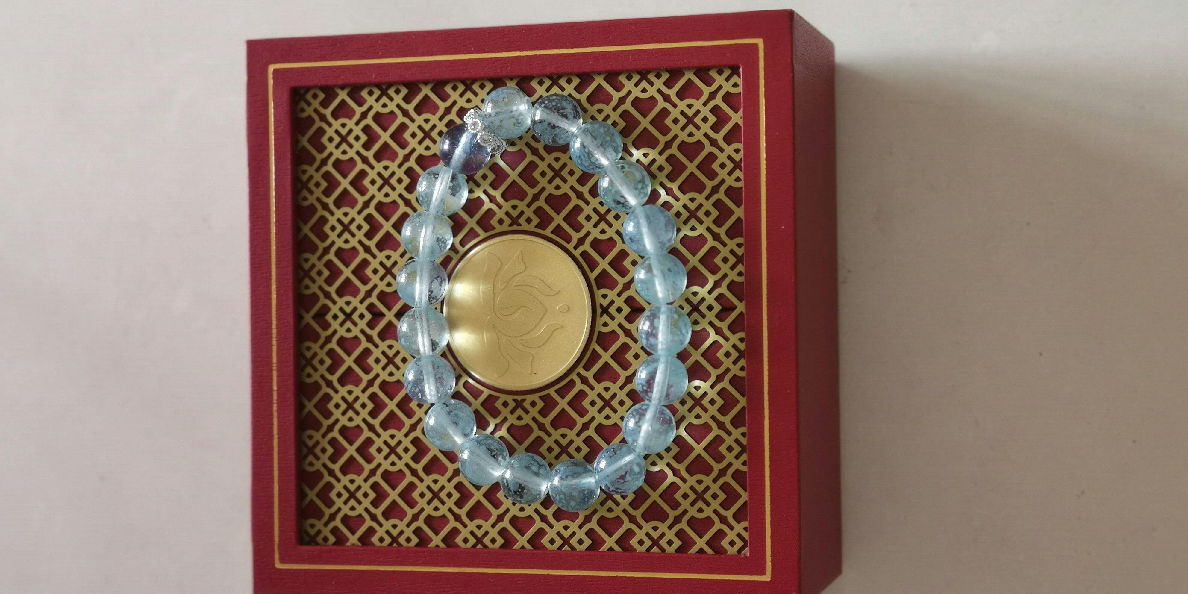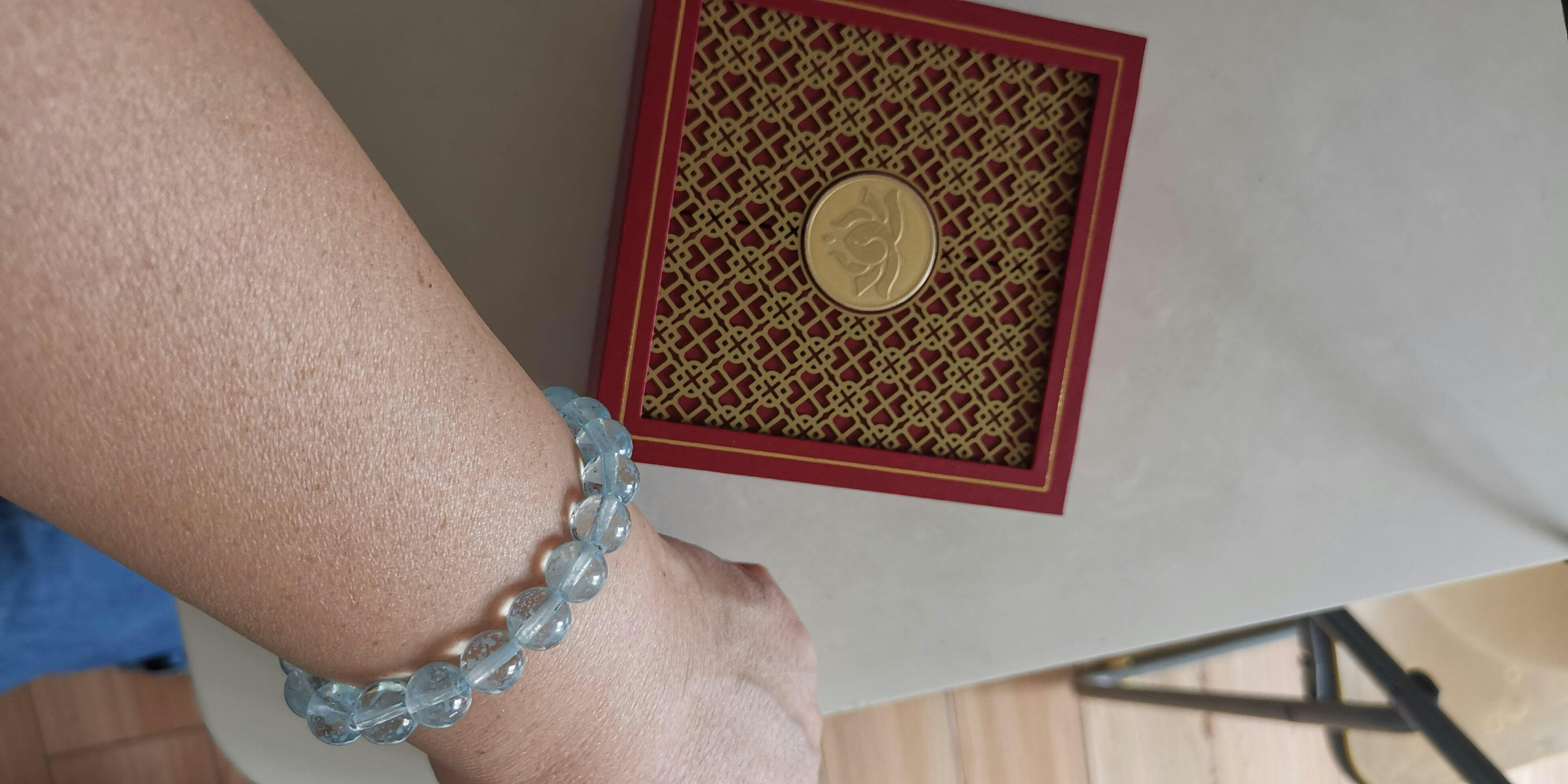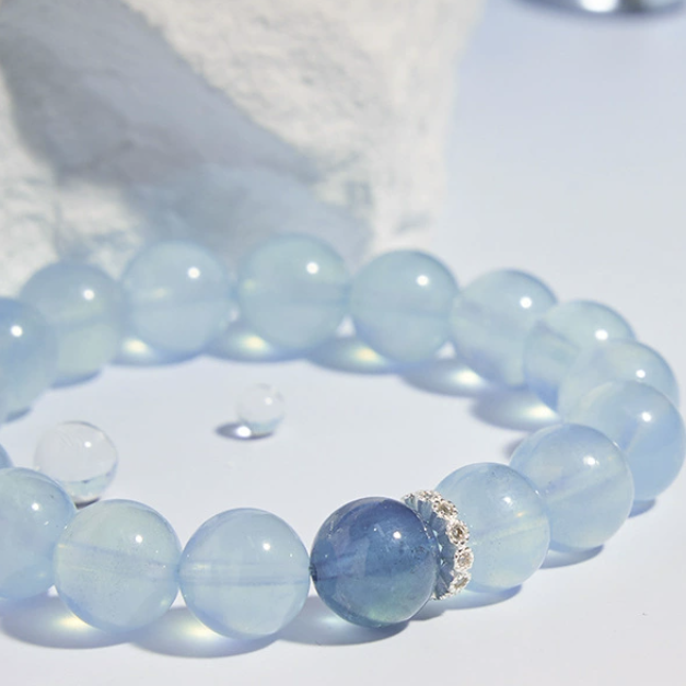 A tranquil blend of pale aquamarine and a single deep blue beryl bead, separated by a crystal ring that adds a touch of luminous grace. Known as the “stone of courage,” aquamarine empowers the heart to embrace love fearlessly and speak with clarity. Its oceanic hue embodies serenity, honesty, and gentle emotional flow.