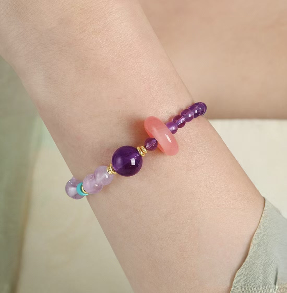 The Aurora Flow Bracelet captures the serene transition of light through shades of violet and blush. Crafted from luminous amethyst with a soft pink crystal centerpiece, it embodies calm strength and graceful transformation. Accented with golden and turquoise details, this piece brings a quiet sense of fortune and emotional clarity — a reminder that flow itself is the path to harmony.