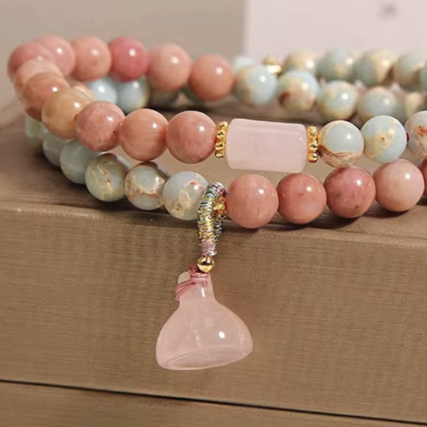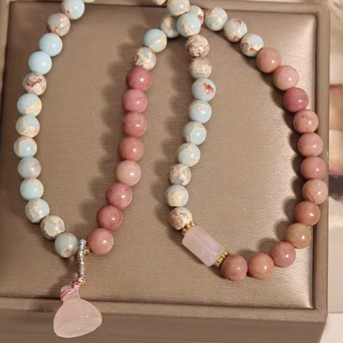 Elegant and softly radiant, the Blush Serenity Bracelet combines the nurturing energy of Shoushan stone with the romantic warmth of rhodochrosite. The dual strands of pink and sky-blue tones mirror harmony between heart and mind, while the rose quartz bottle charm adds a touch of sweetness and emotional calm. Hand-polished and gold-accented, this bracelet reflects both serenity and sophistication — a modern symbol of grace and inner strength.