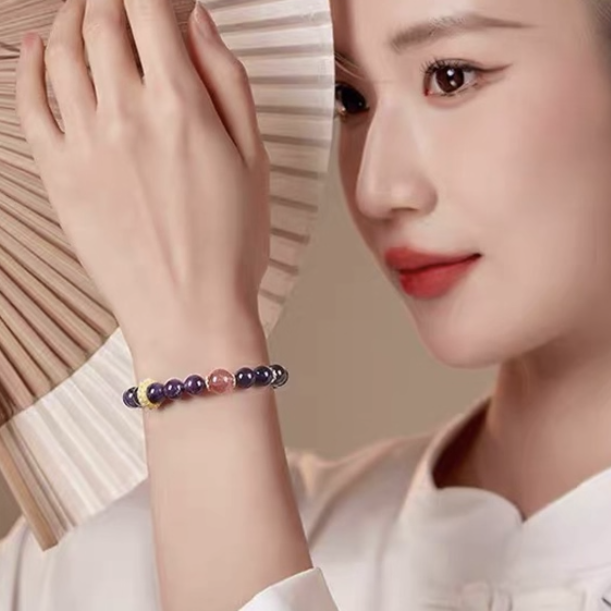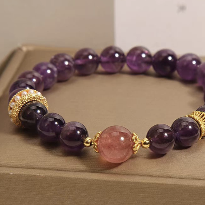 Infused with quiet elegance, the Celestial Romance Bracelet blends deep violet amethyst with a luminous strawberry quartz centerpiece. The amethyst radiates calm sincerity and faithful devotion, while the soft pink crystal glows with tenderness and romantic harmony. Finished with golden and pearl-accented details, this bracelet celebrates love that is both steadfast and divine — a bond of heart and spirit that endures through time.