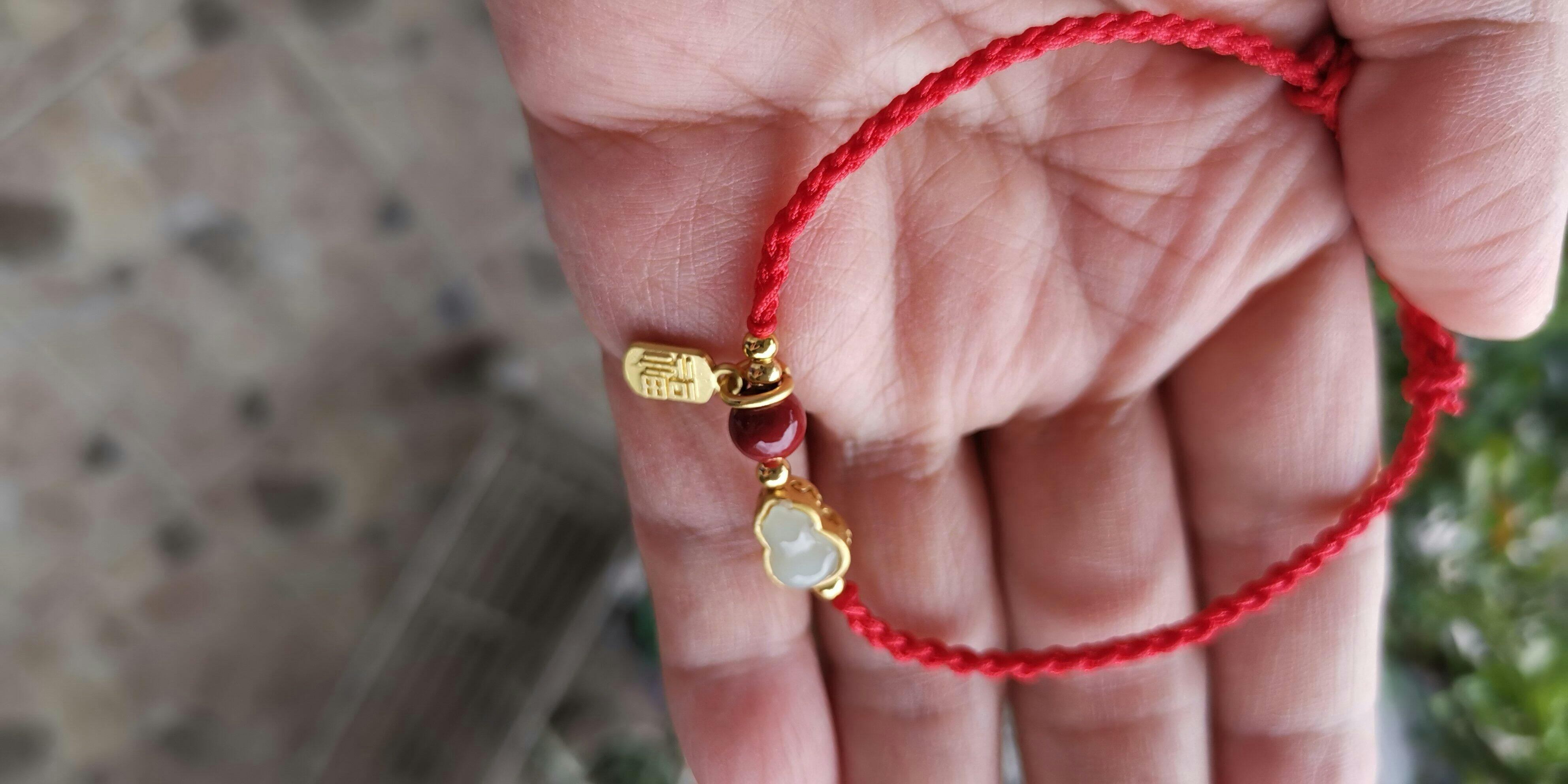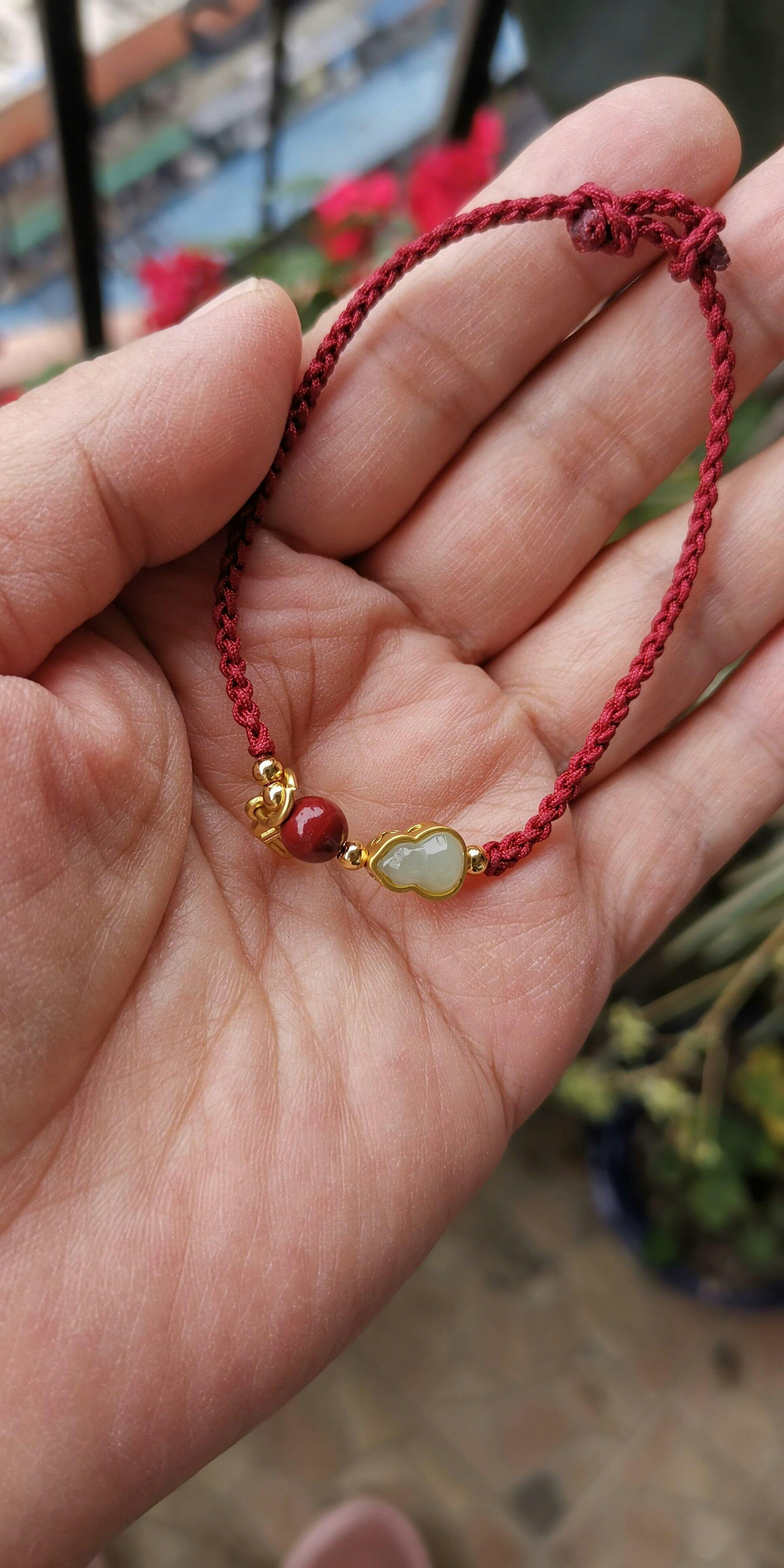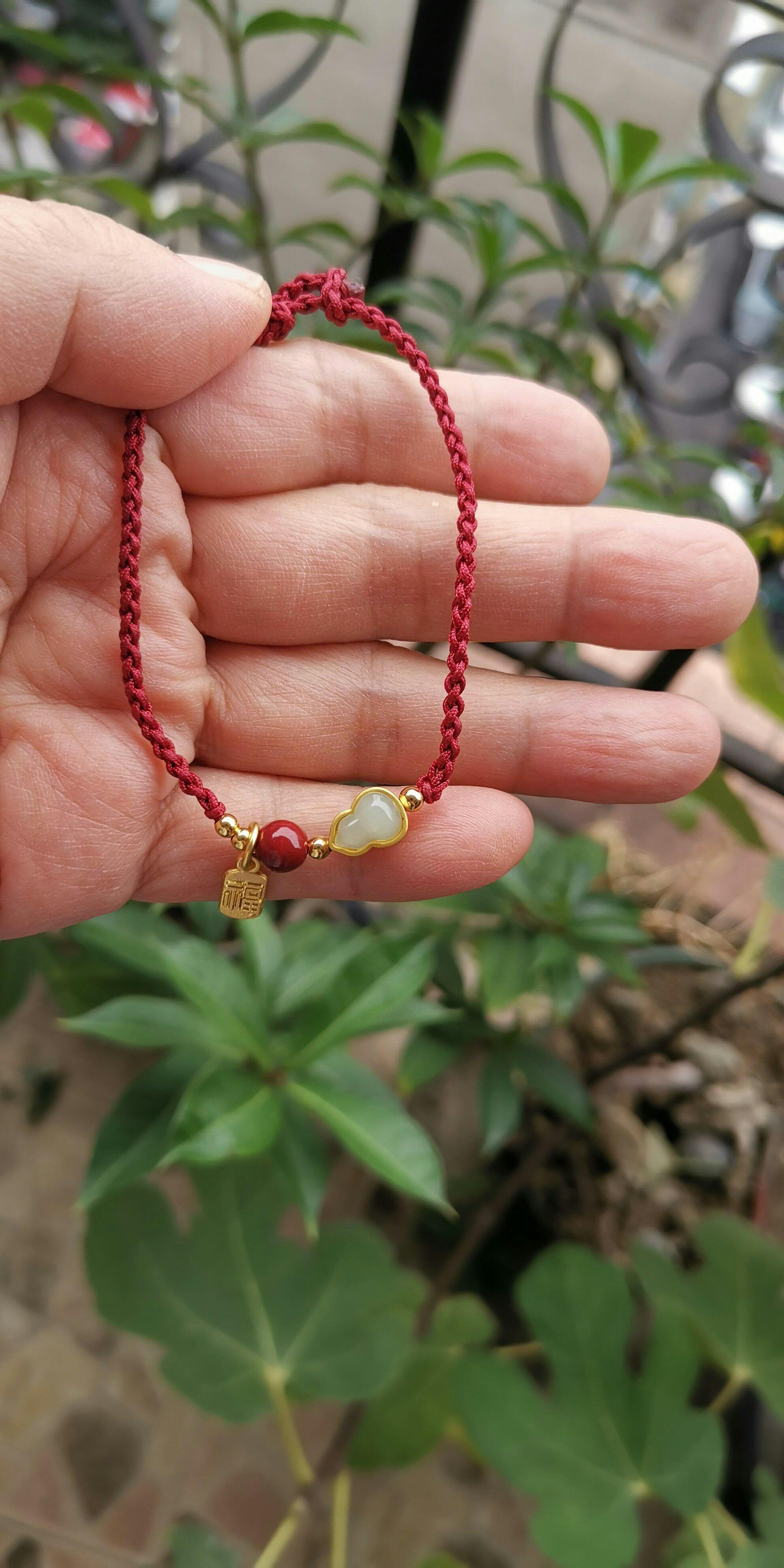 A classic red string, refined by hand-braided macramé and a trio of meaningful accents: a smooth jade gourd charm framed in gold-tone, a glossy cinnabar bead, and a petite fortune tag. The gourd symbolizes “fu & lu” (good fortune & prosperity) in Chinese culture, while the red cord carries wishes of protection and vitality. Finished with an adjustable sliding knot, it wears light and secure—ideal for daily styling or thoughtful gifting.