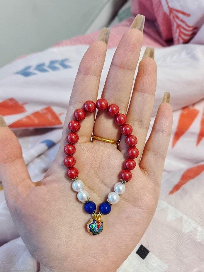 The Cinnabar & Pearl Longevity Lock Bracelet blends natural cinnabar’s deep red vitality with the soft luster of freshwater pearls and an enamel “Longevity Lock” charm — a symbol of peace, blessings, and enduring harmony. This elegant piece carries both protection and grace, embodying the timeless balance of beauty and spiritual strength.