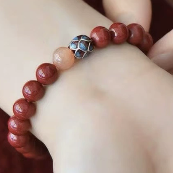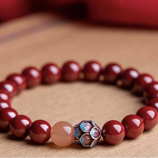 • Materials: Natural cinnabar (Zijin Sand), sunstone, silver enamel lotus bead, elastic cord