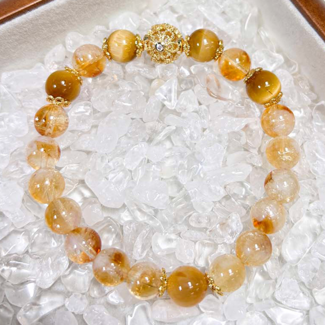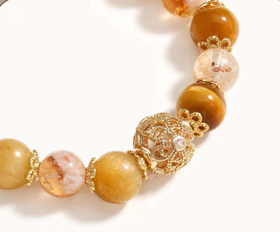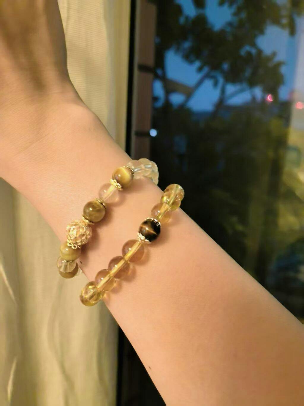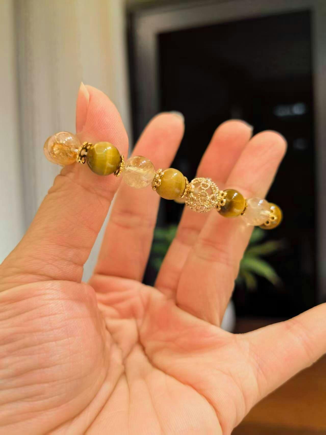 • Materials: Natural citrine or yellow phantom quartz (choose variant) & tiger’s eye & gold-tone alloy filigree bead & gold-tone micro spacers & elastic cord