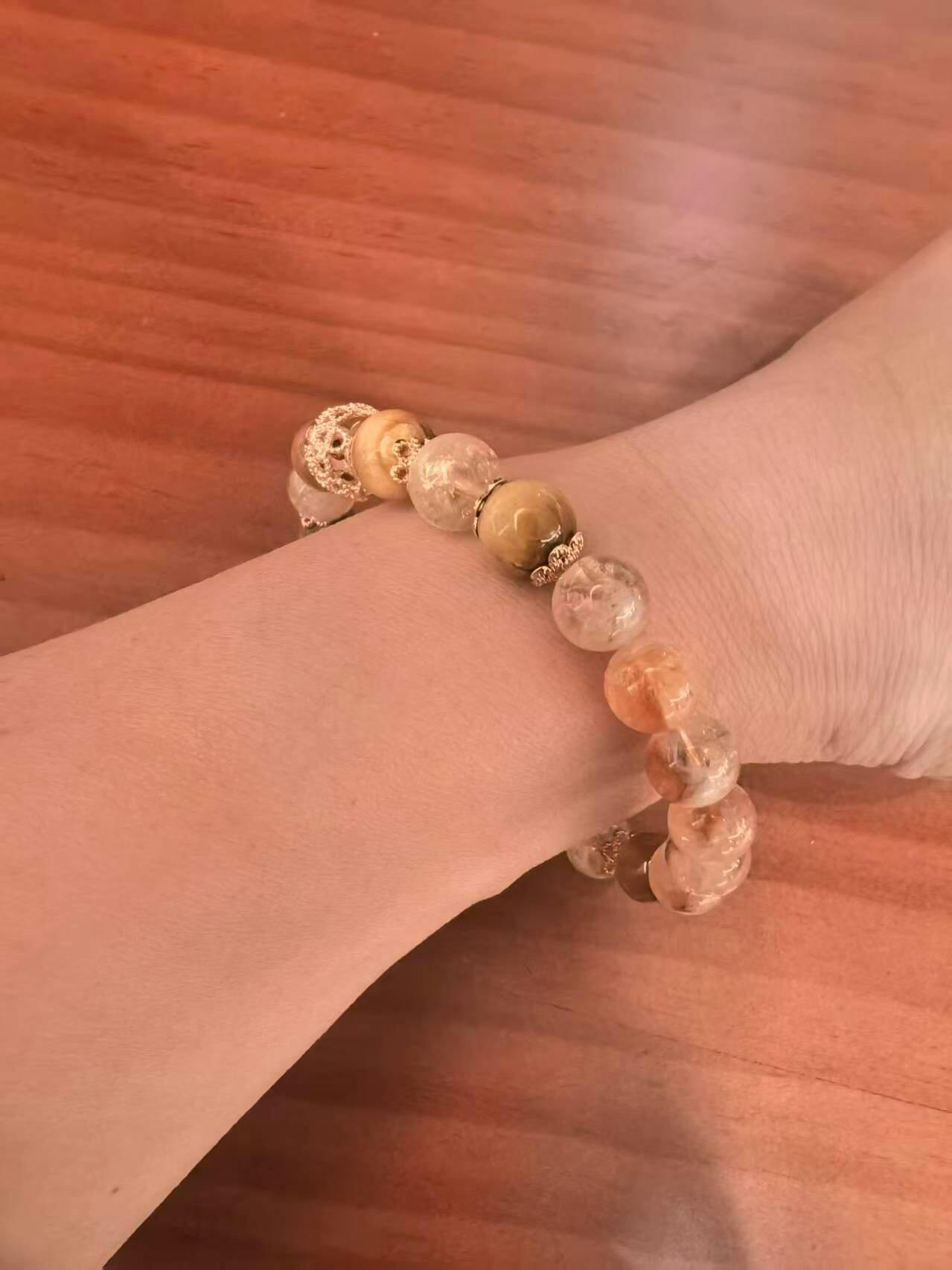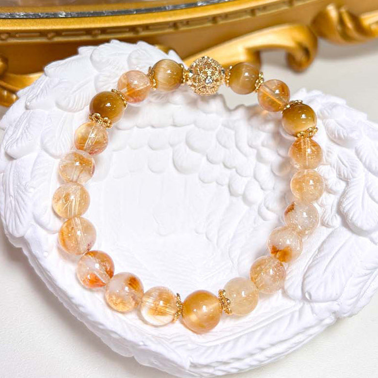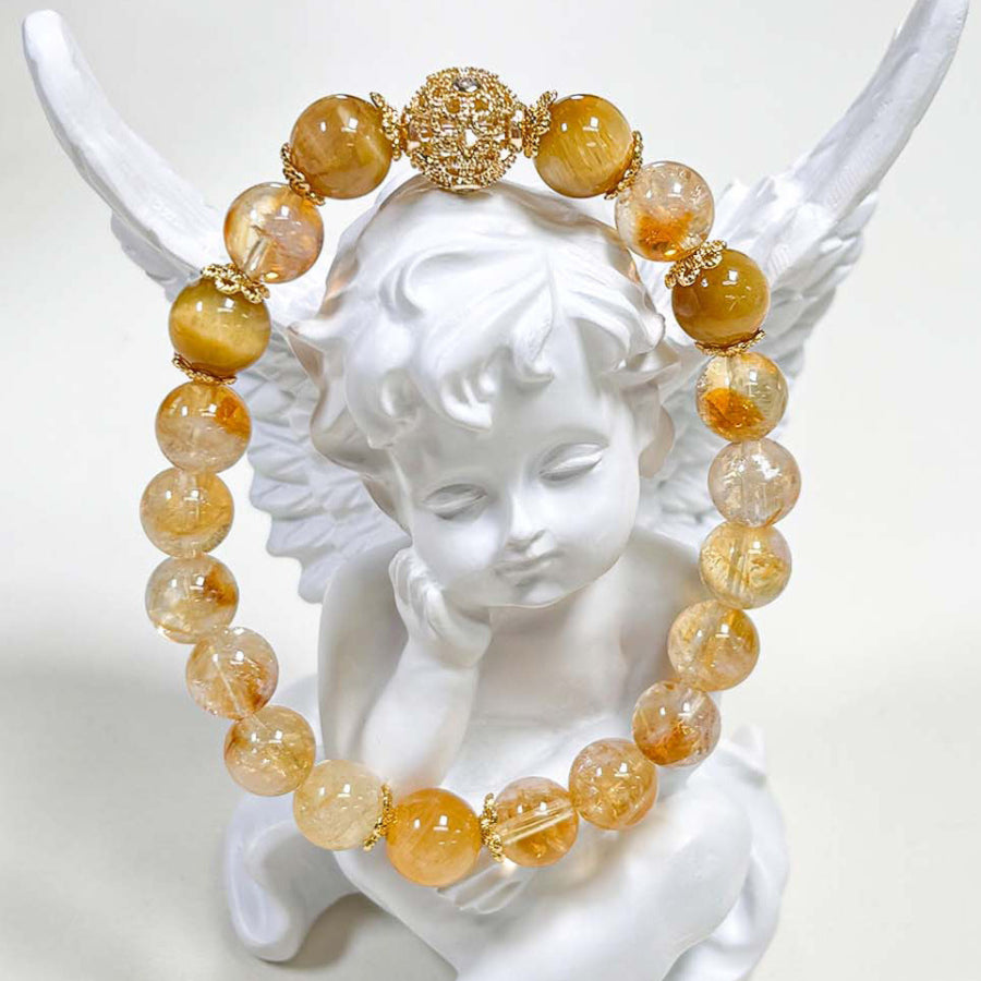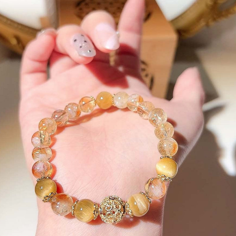 • Materials: Natural citrine or yellow phantom quartz (choose variant) & tiger’s eye & gold-tone alloy filigree bead & gold-tone micro spacers & elastic cord