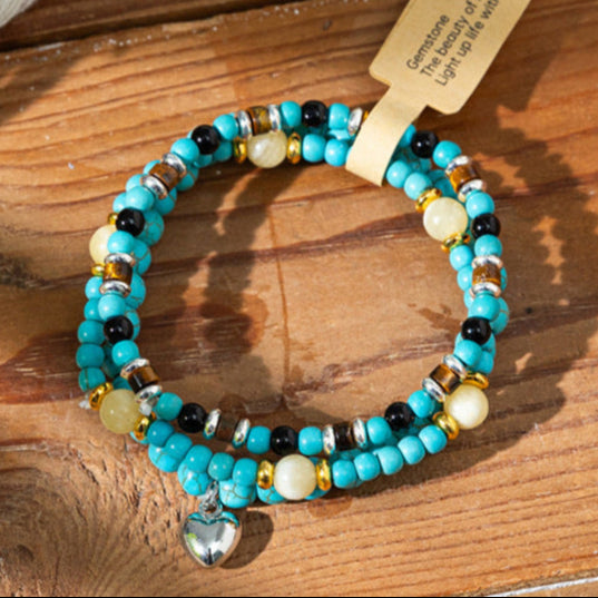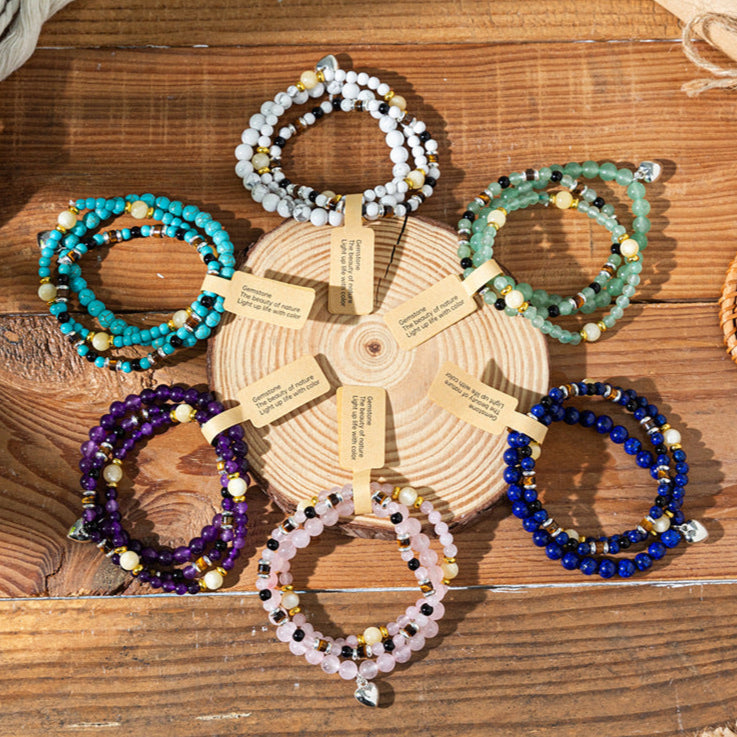 • Materials: Natural gemstones (rose quartz, turquoise, amethyst, lapis lazuli, aventurine, howlite) & gold-tone & silver-tone alloy spacers & silver-tone heart charm & elastic cord