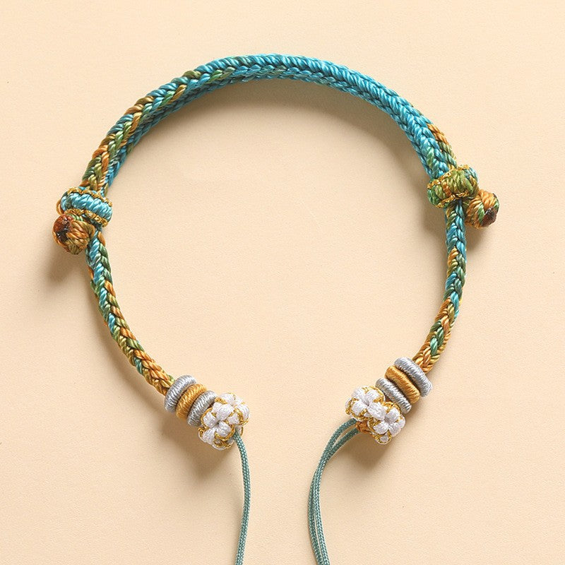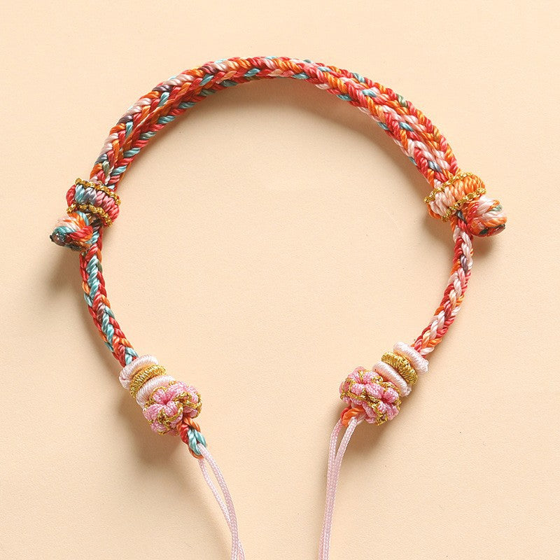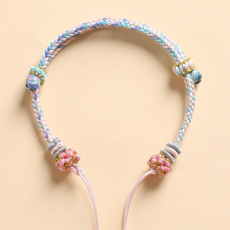 A soft pastel braid built for fast, satisfying DIY. This semi-finished bracelet base features tidy eight-strand cord work with two peach-blossom knot ends and smooth wrap details. Finish it in minutes by threading crystals, cinnabar beads, pendants, or initials. The sliding pull makes sizing simple for daily wear or gifting.