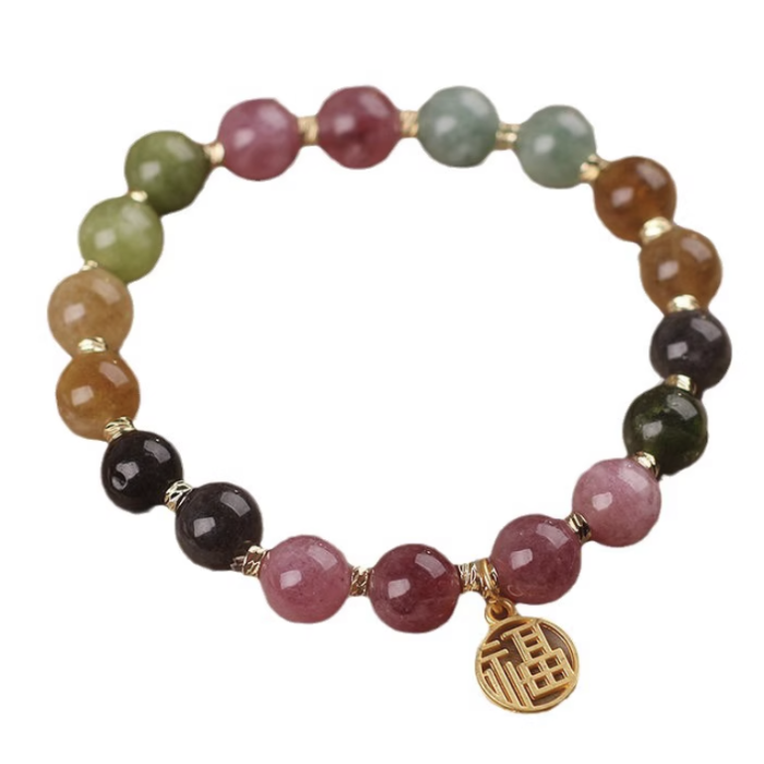 The Fortune Blessing Bracelet brings together the joyful hues of natural tourmaline — from rose pink and forest green to honey gold — each color representing love, vitality, and abundance. At its heart lies a gold “福” charm, an ancient Chinese symbol of happiness and good fortune. Hand-polished to reveal each bead’s inner light, this bracelet radiates warmth and harmony — a timeless token of balance, beauty, and protection.