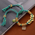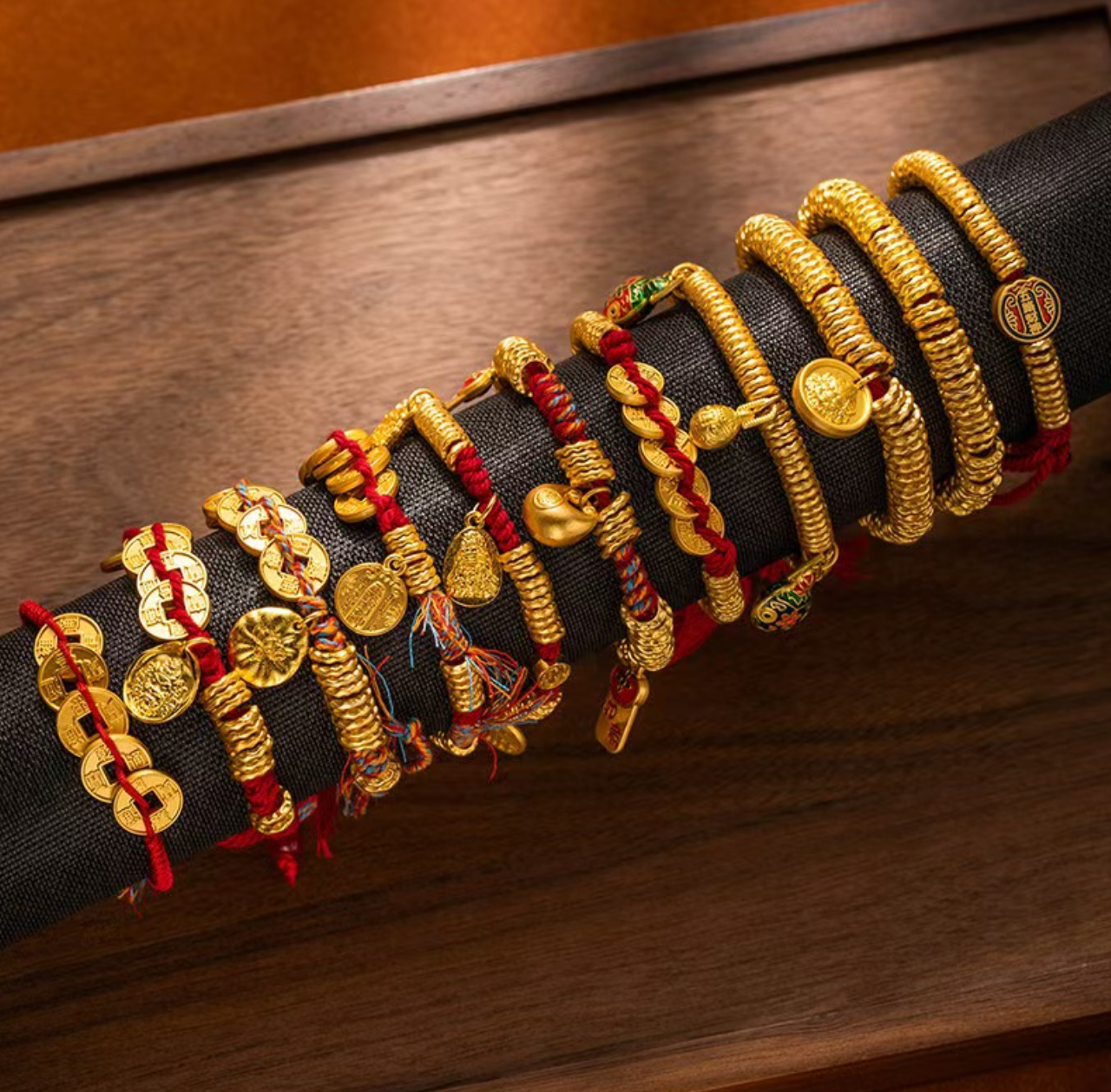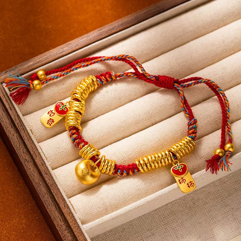 A modern take on heritage wristwear: tightly braided cords hold a run of sand-gold finish coil rings, stacked like travel funds & good luck tokens. A Caishen wealth coin charm anchors the story, while the sliding closure keeps the fit easy & secure. Available in sophisticated colorways—from festive red to soft blush to jade-inspired teal—for a polished, New Chinese Style accent that layers beautifully with bangles or bead stacks.