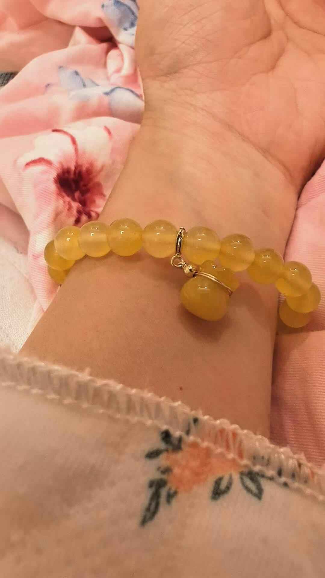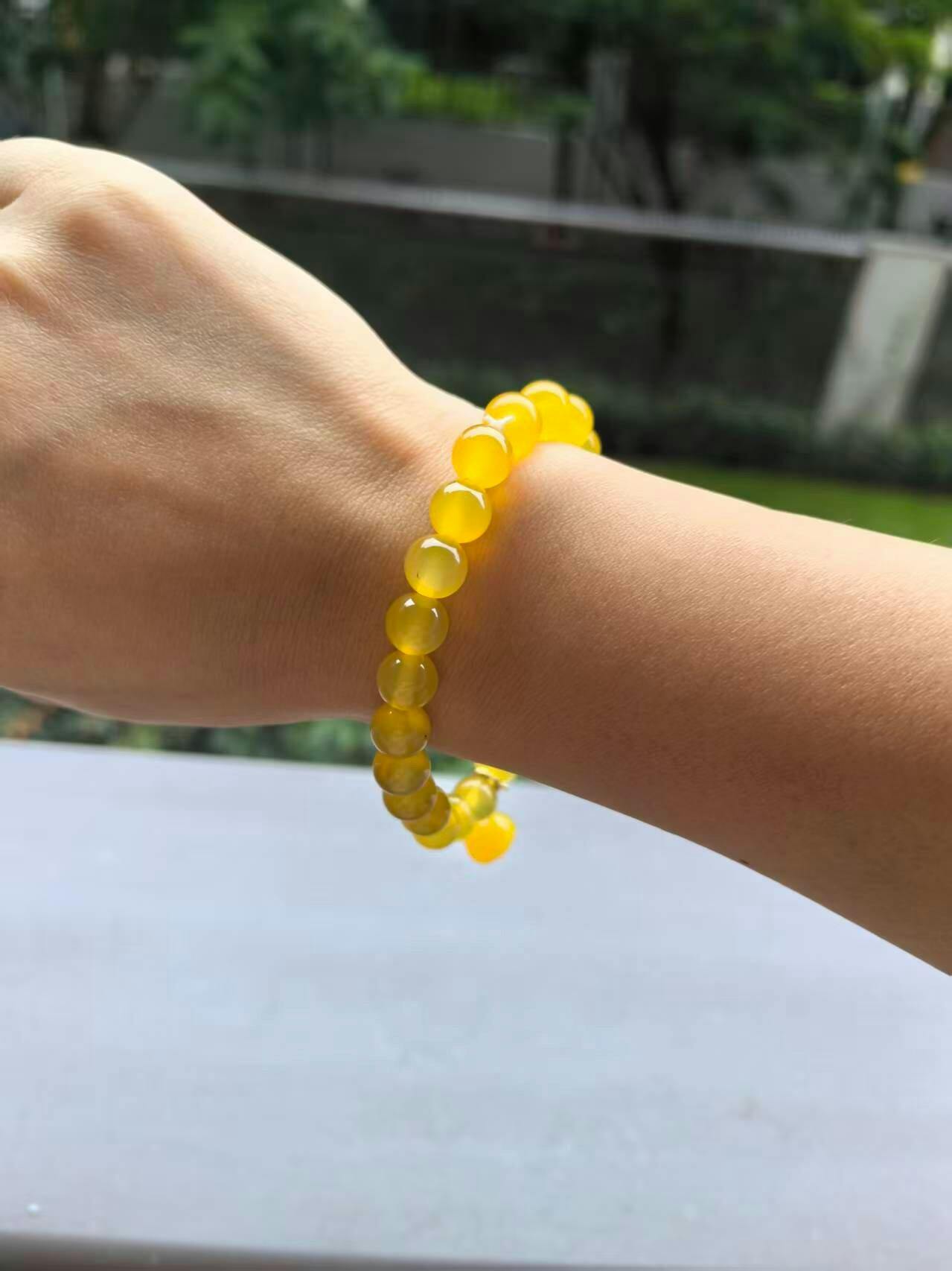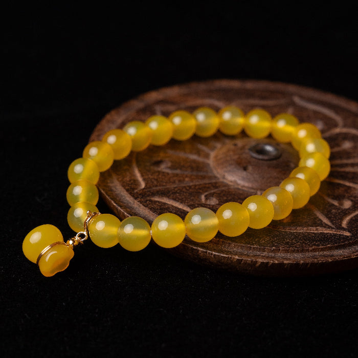 Bathed in warm sunlight tones, the Golden Fortune Bracelet radiates pure joy and wealth energy. Crafted from luminous amber-yellow chalcedony and accented with a gold ingot charm, it symbolizes prosperity and success in every endeavor. Its soft glow uplifts the spirit, while the round form invites harmony, optimism, and the flow of abundant blessings.