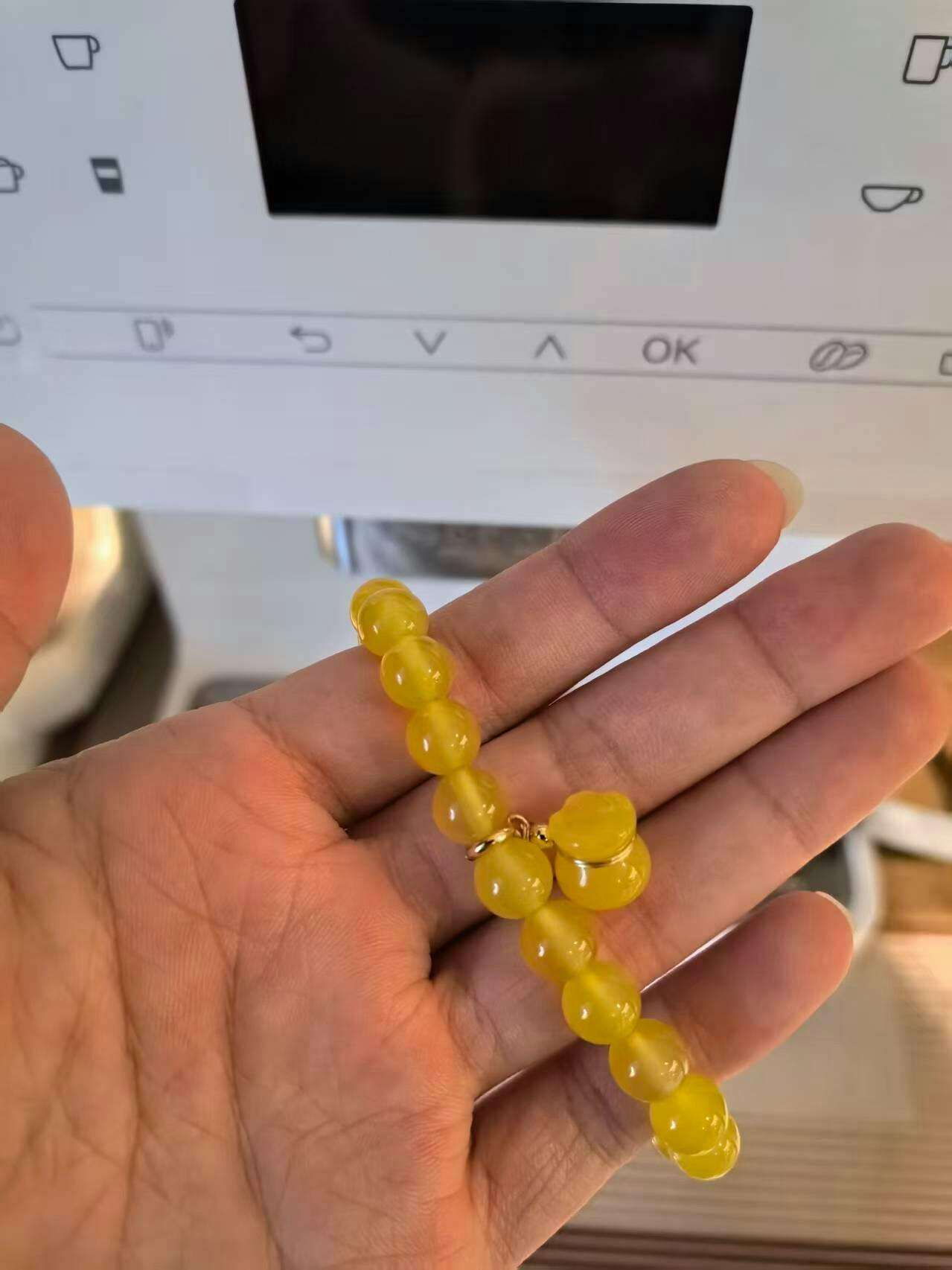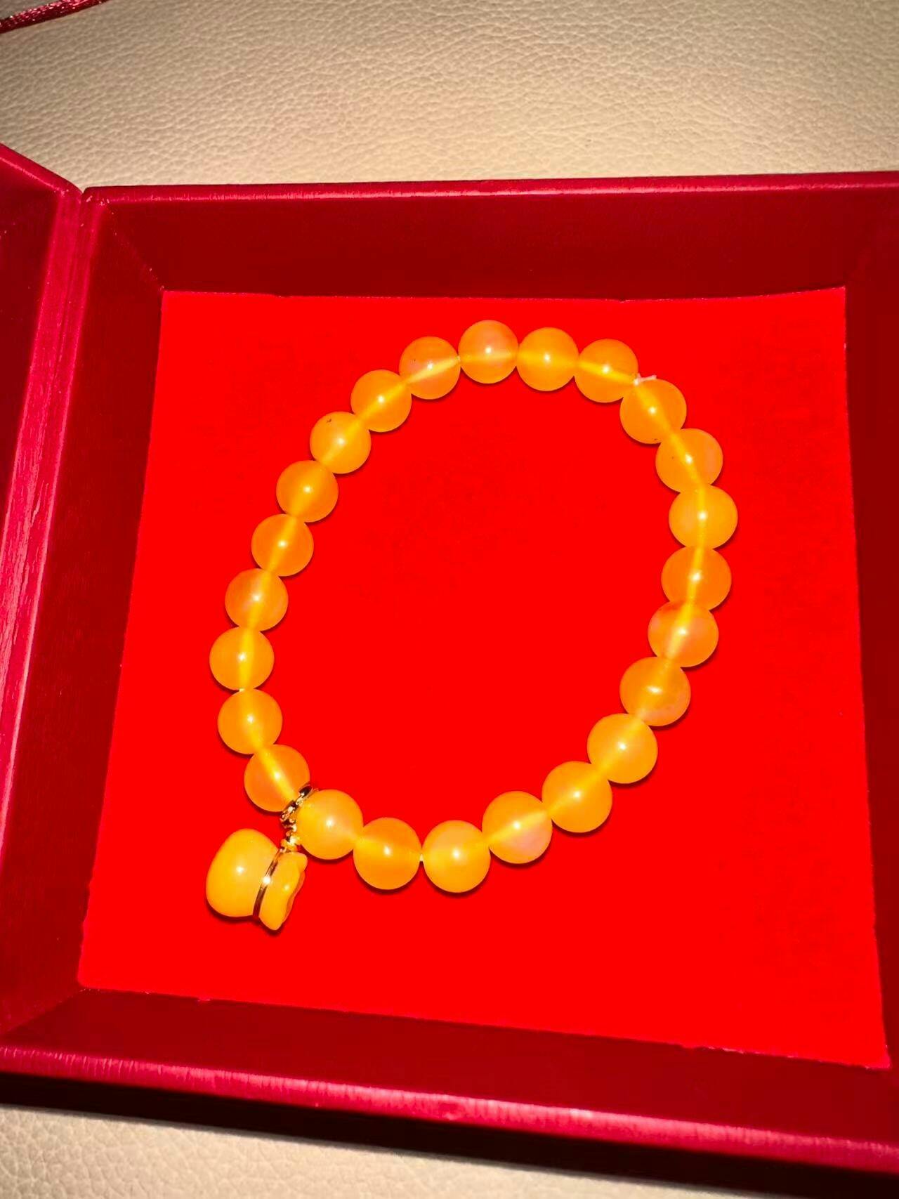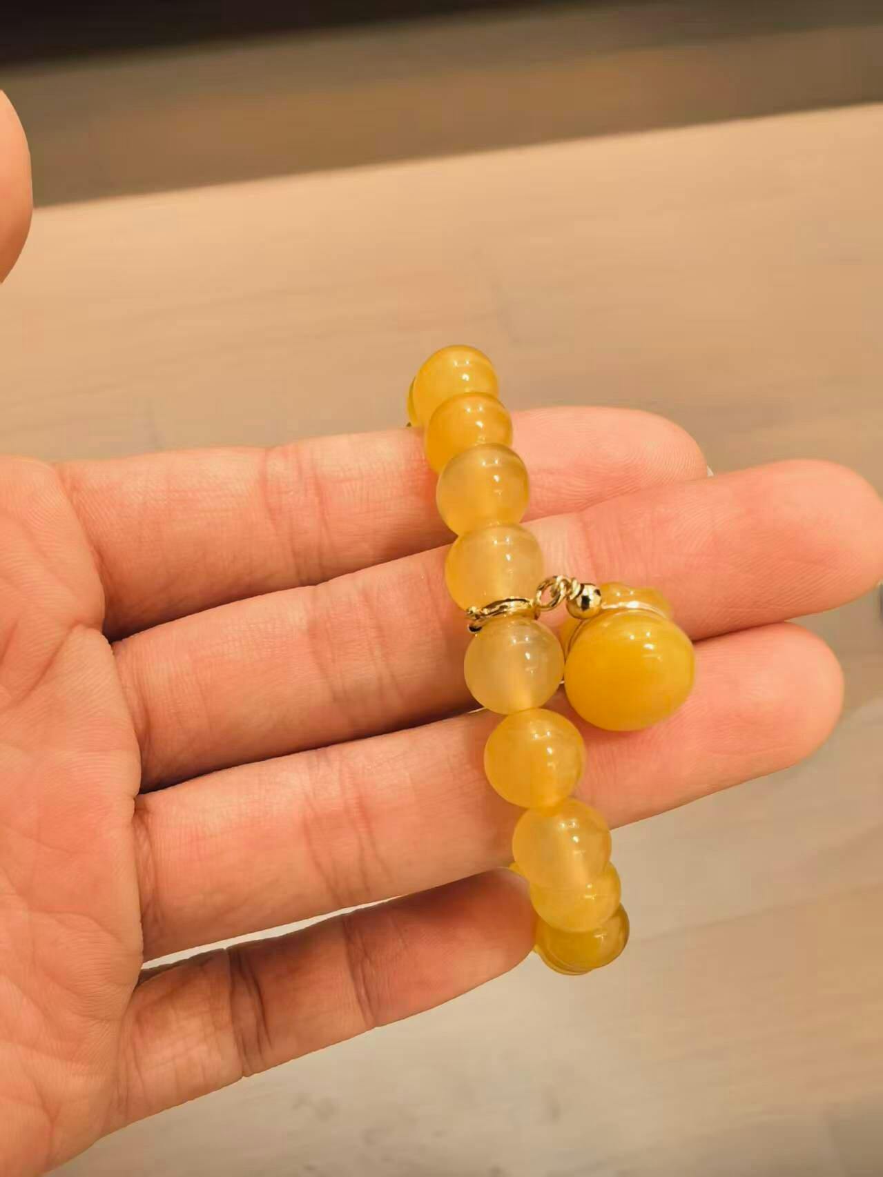 Bathed in warm sunlight tones, the Golden Fortune Bracelet radiates pure joy and wealth energy. Crafted from luminous amber-yellow chalcedony and accented with a gold ingot charm, it symbolizes prosperity and success in every endeavor. Its soft glow uplifts the spirit, while the round form invites harmony, optimism, and the flow of abundant blessings.