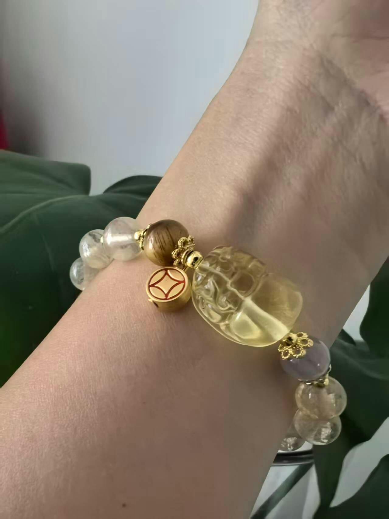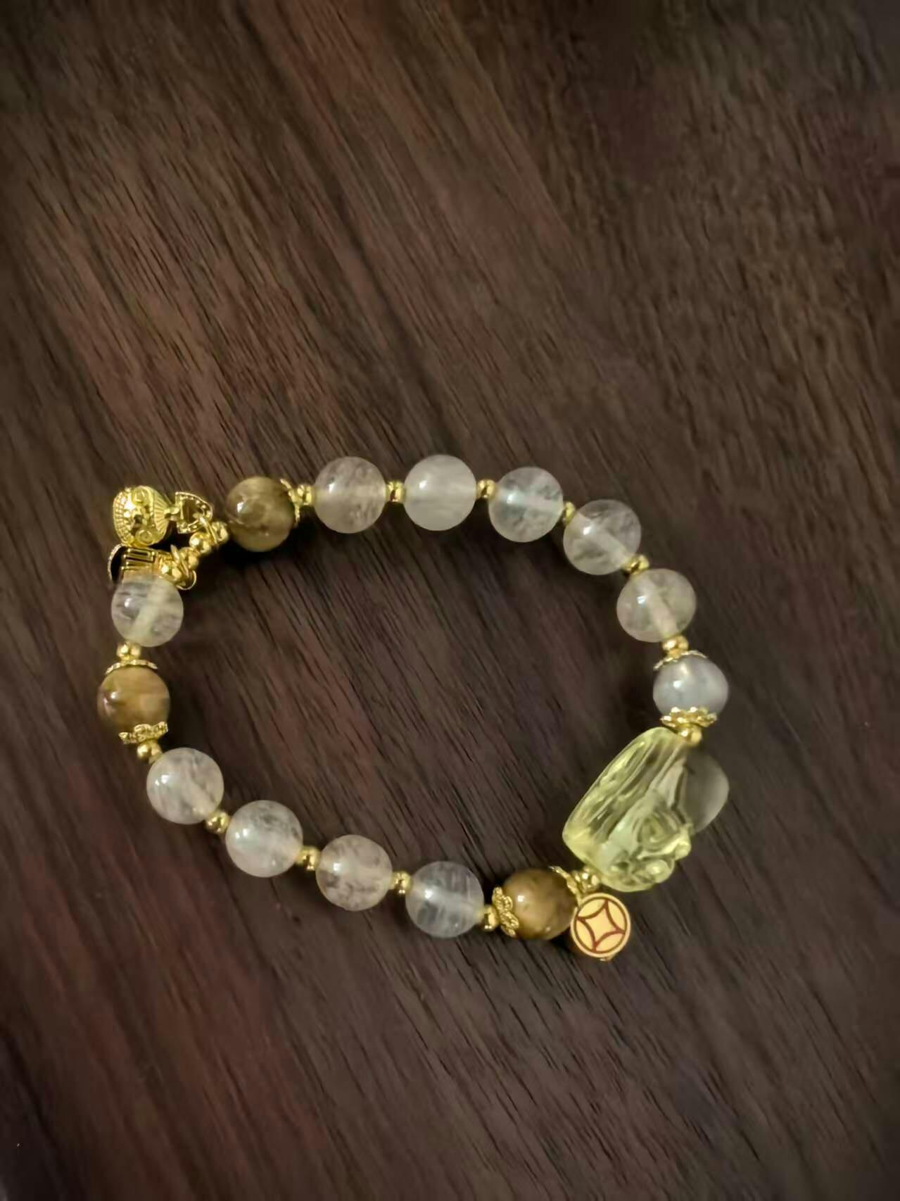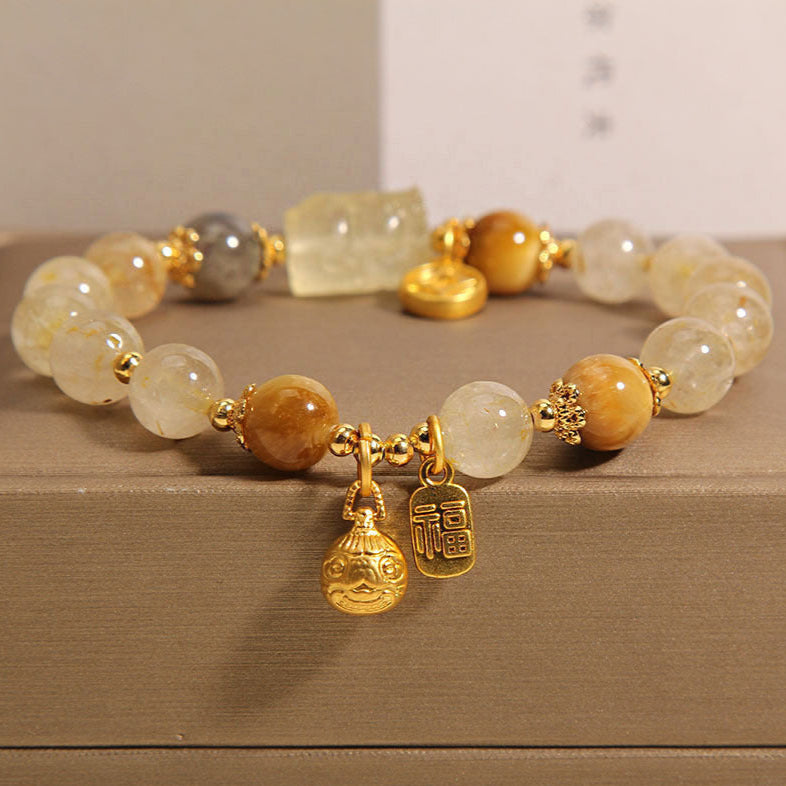 • Materials: natural golden rutilated quartz beads, gold-tone spacer details, petite blessing charm, premium elastic cord