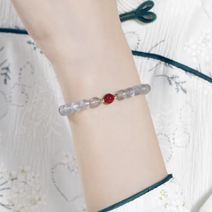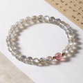 A quiet strand of gray moonstone—subtly iridescent with that soft, floating glow—meets a single strawberry-quartz bead for a gentle point of color. Hand-strung on comfortable elastic with petite gold-tone spacers, it wears light and refined, bringing a calm, feminine touch to everyday looks or layered stacks.