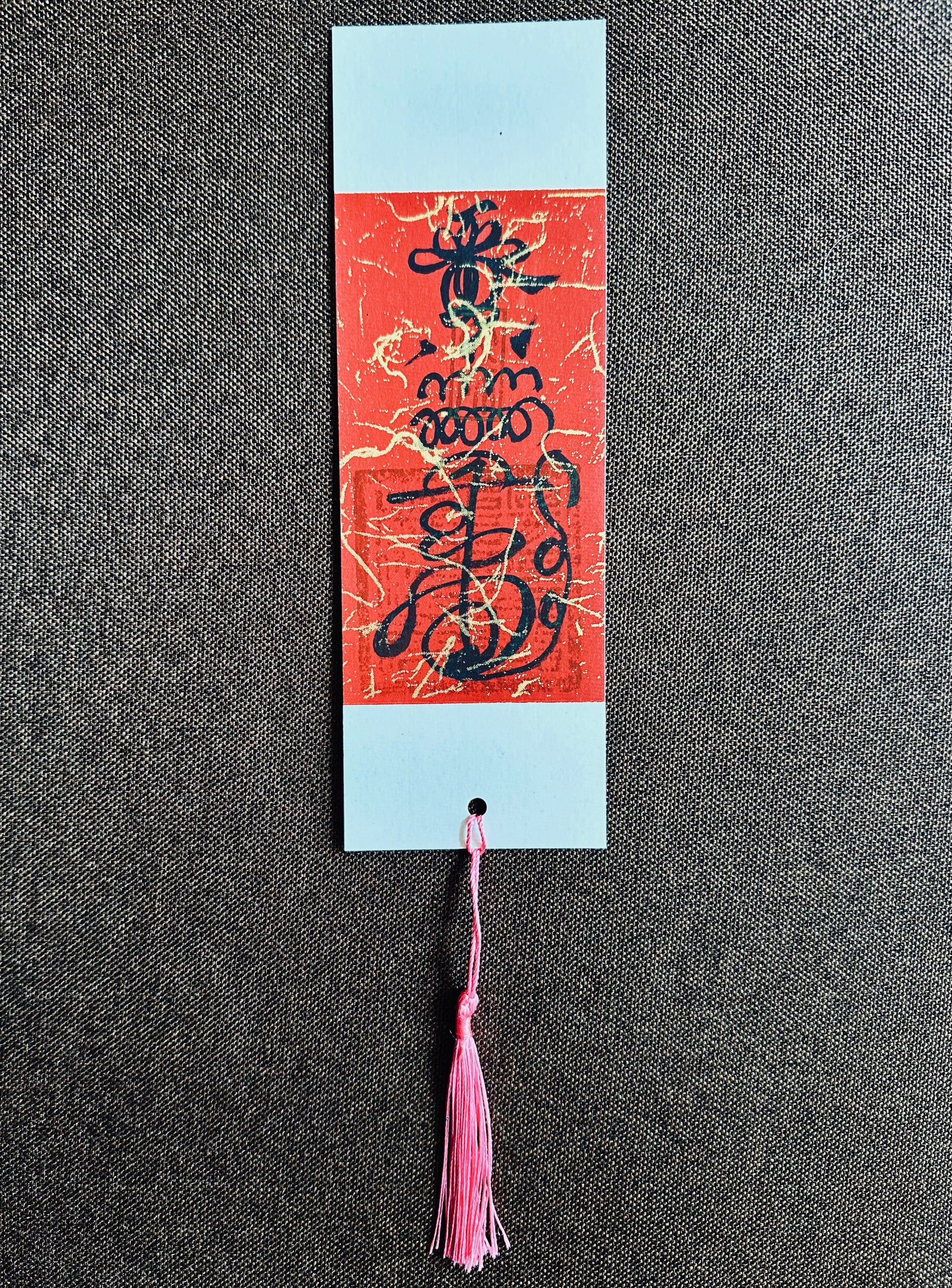 • Material: red talisman paper with gold marbling on cardstock; black sumi script; seal impressions; pre-punched hole & tassel