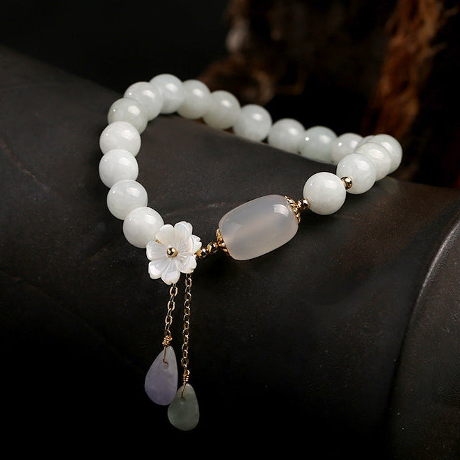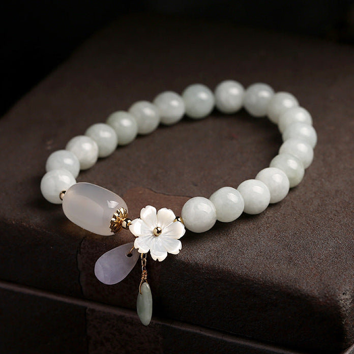 Handcrafted bracelet featuring natural jade, apple agate & shell flower charm