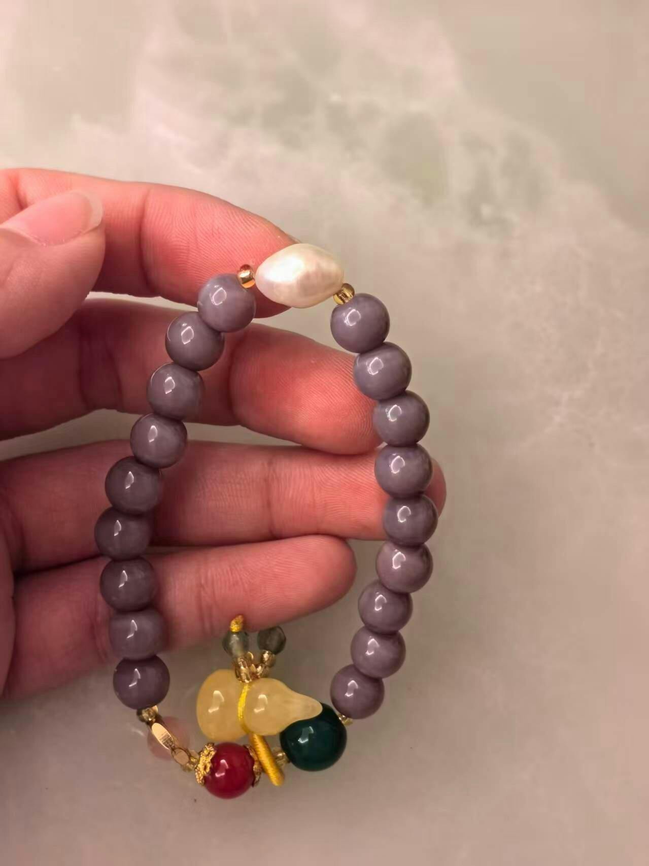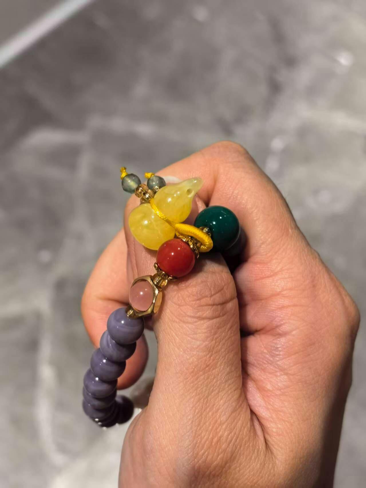 A serene, auspicious bracelet crafted from kiln-fired liuli glass in a soft lilac hue—silky to the touch and quietly luminous. At the focal sits a cheerful cluster: a yellow liuli hulu gourd for blessings, a rose-pink cabochon in a round bezel, and petite green & red liuli accents. Warm gold-tone details complete the piece without overpowering the color. Hand-strung on durable elastic, it slips on easily and wears light all day.