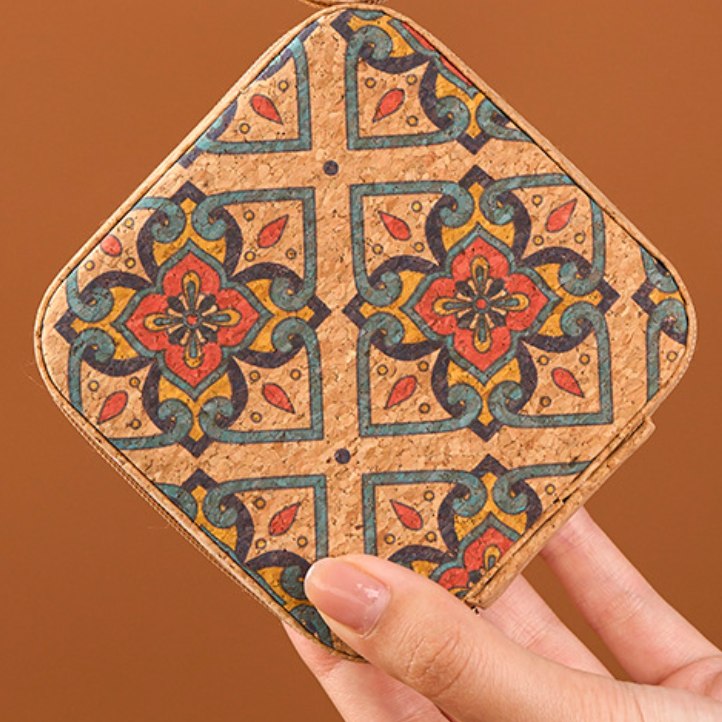 A compact, artful jewelry box inspired by bohemian spirit and natural cork texture. Each piece carries a unique vintage-style print — from floral motifs to mosaic patterns — evoking mindful travels and quiet mornings. Crafted from soft PU leather, it’s designed for rings, necklaces & earrings, keeping your treasures secure wherever you go.