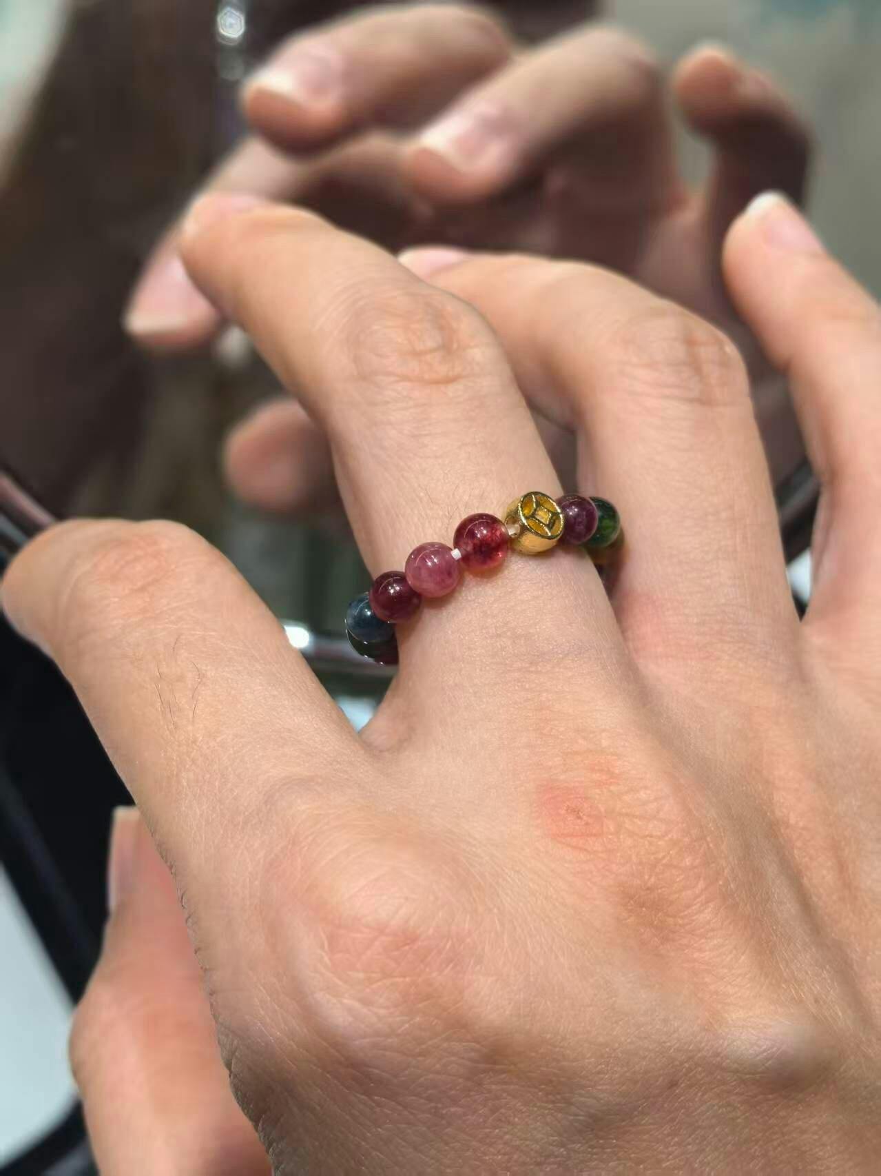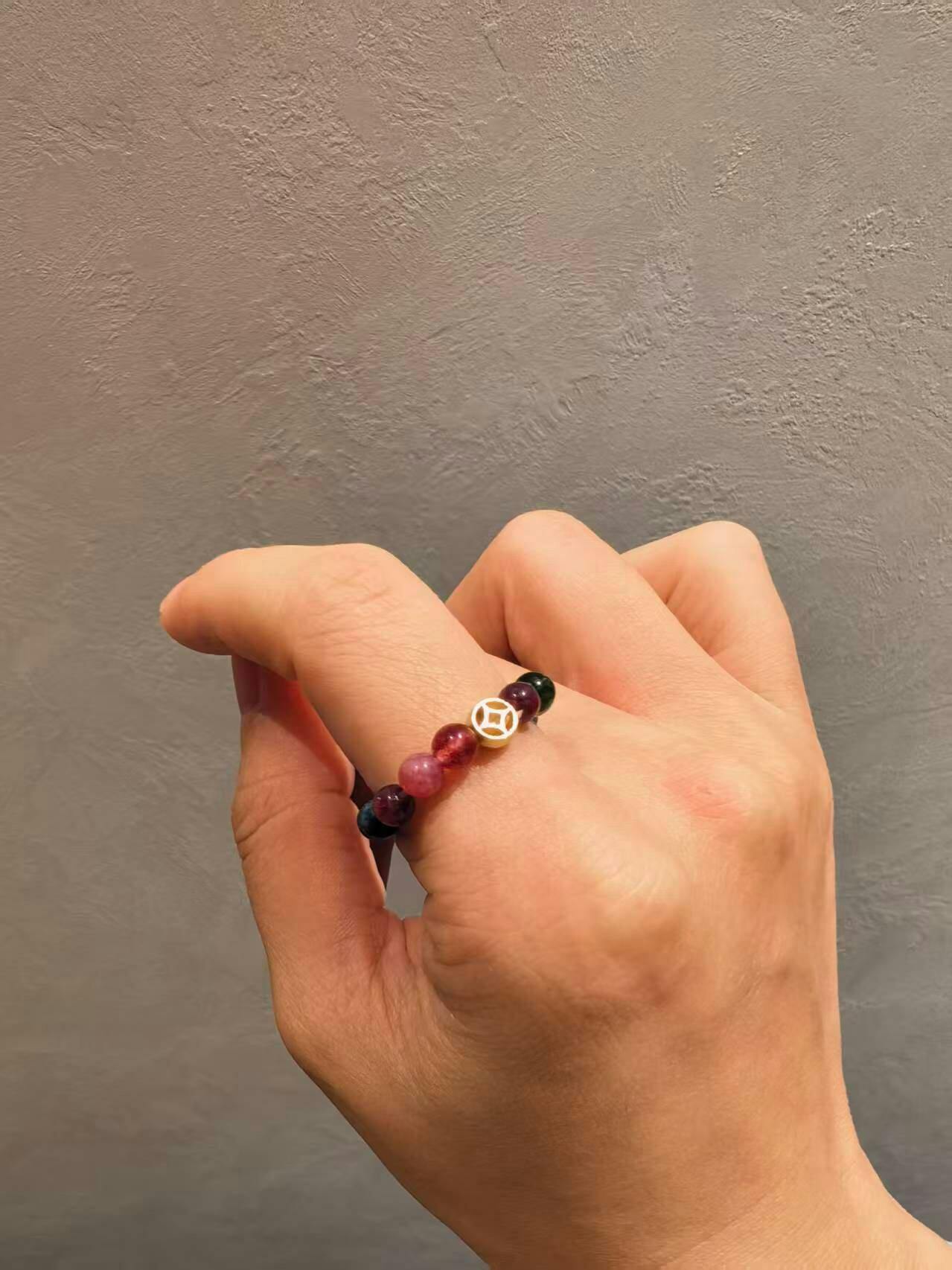 This women’s ring is handcrafted from natural tourmaline beads, prized for their wide spectrum of vibrant colors that embody joy, energy & emotional balance. The strand is highlighted with a coin-shaped focal bead, symbolizing prosperity, fortune & the smooth flow of opportunities. Lightweight and versatile, this tourmaline ring offers both aesthetic elegance and talismanic meaning, making it ideal for everyday wear or stacking with other jewelry.