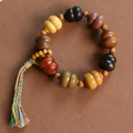 This handcrafted bracelet features nine distinct types of rare woods, each carved into symbolic gourd-shaped beads and strung with small spacer woods for balance. The gourd is long cherished as a talisman of health, protection & prosperity. A multicolored tassel adds a finishing touch, giving the piece a traditional yet versatile look. Designed as a unisex accessory, the bracelet carries layered meaning—each type of wood offering its own aura of strength, grounding, or prosperity. With nine unique beads, it embodies the spirit of “many treasures united,” making it both a statement adornment and a spiritual talisman.
