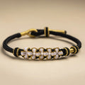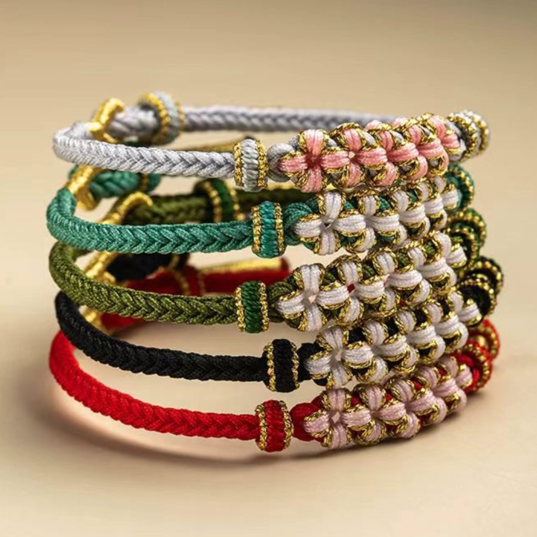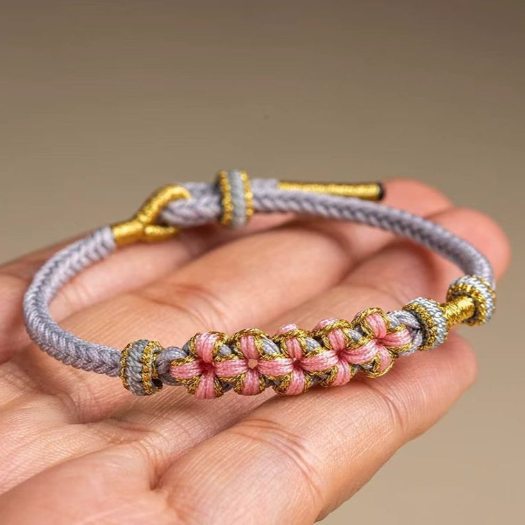 A refined cord bracelet built around a panel of peach blossom knots bordered by tidy contrast wraps. The open “bead-through” channels let you slide on small beads or charms later, so you can keep it minimal today and personalize it tomorrow. Finished with a smooth adjustable pull, it sits flat and comfortable for everyday styling.