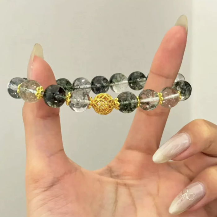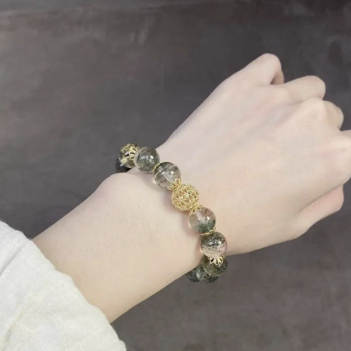 A serene composition of translucent quartz infused with soft moss-like inclusions, the Phantom Garden Bracelet mirrors a miniature landscape of nature within each bead. Known as the crystal of renewal and clarity, green phantom quartz encourages personal growth, emotional balance, and spiritual grounding. Accented with a delicate gold filigree centerpiece, it carries an aura of elegance and quiet strength — a talisman of progress and inner calm.