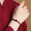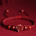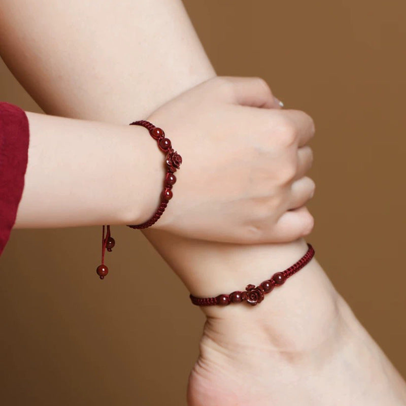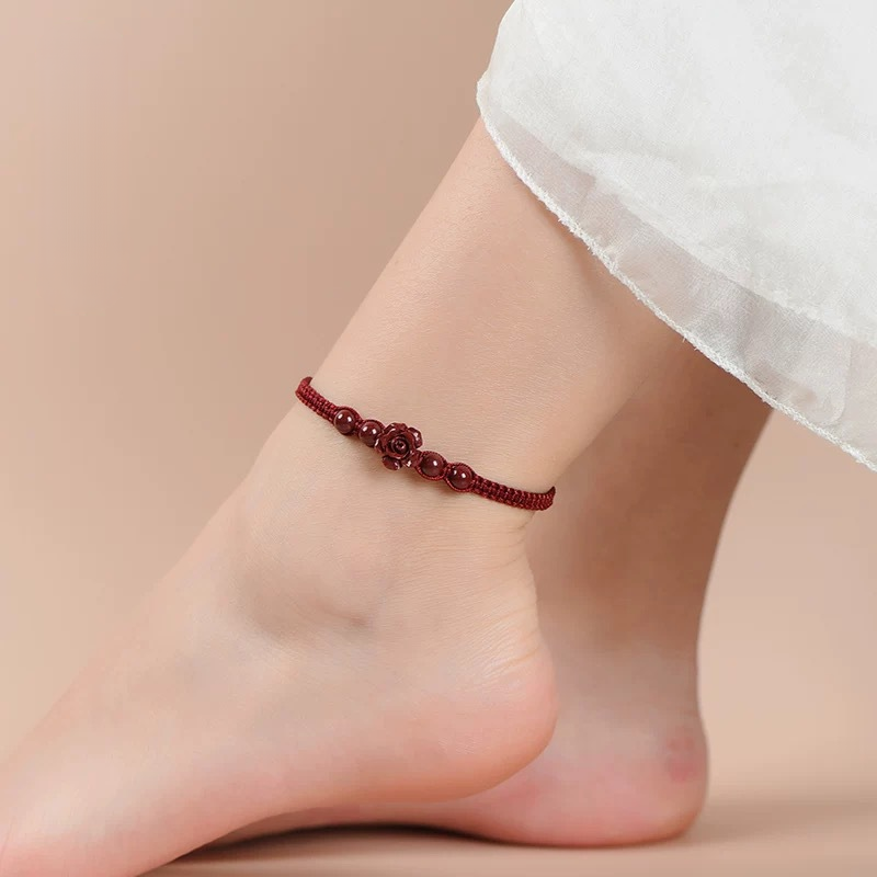 A delicate rose carved in shimmering purple goldstone anchors this wine-red macramé strand. Glossy matching beads and tight knotwork create a soft, rounded profile that sits comfortably on skin. Finished with an adjustable sliding closure, the piece converts from bracelet to anklet with ease—made for everyday styling, gifting, & layering.