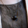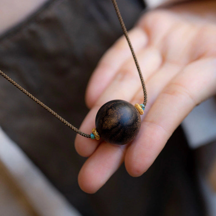 A single, hand-turned sphere of Qinan agarwood (aloeswood) takes center stage in this minimalist pendant. The wood’s organic grain shows quiet depth, framed by petite gold-tone spacers and jade-look accent beads on a slim textile cord. With gentle warmth, a natural aroma emerges—offering a serene, heritage-inspired presence you can wear every day.