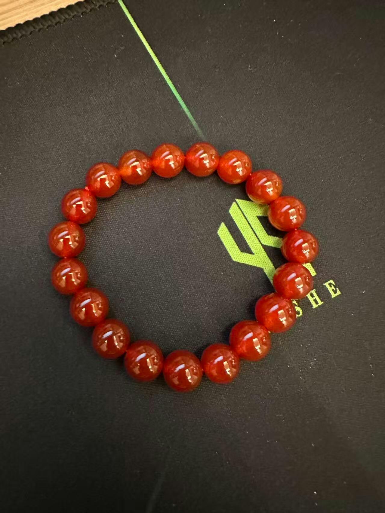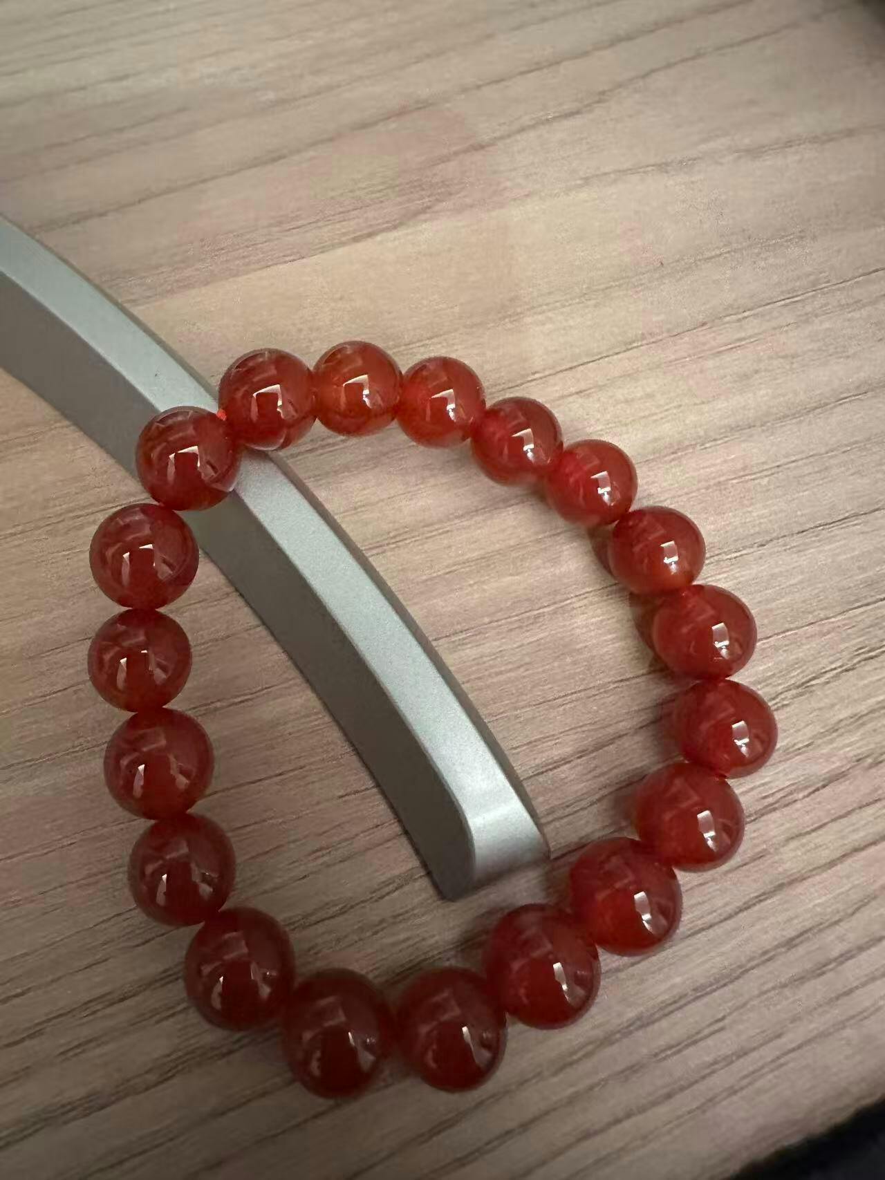 Glossy, translucent red agate in a timeless minimalist strand. Each natural bead shows warm lacquer-red depth that pairs beautifully with daily looks and meditation practice. Hand-strung for a smooth, comfortable fit—quiet strength on the wrist.