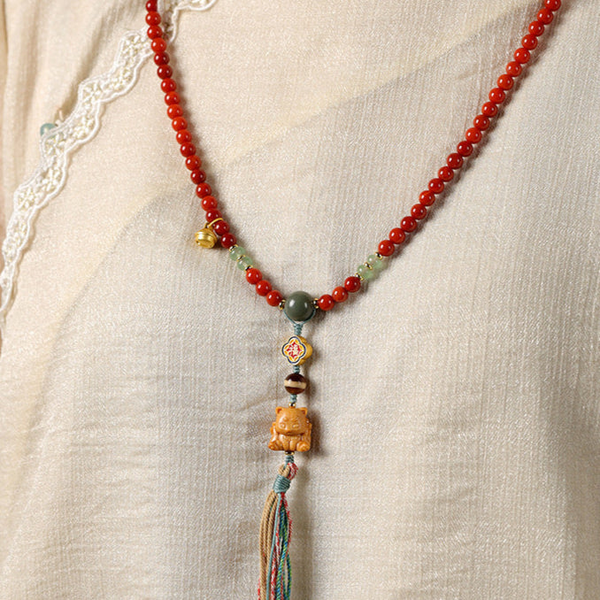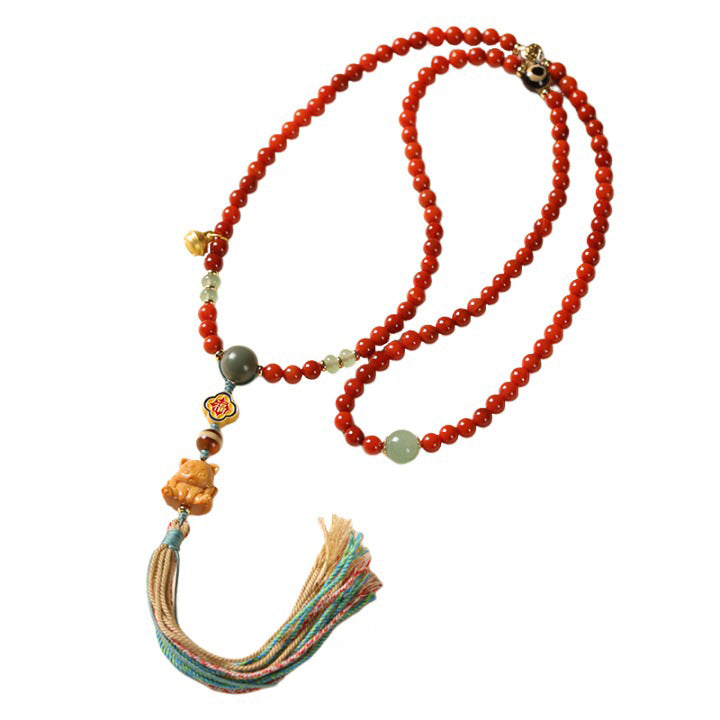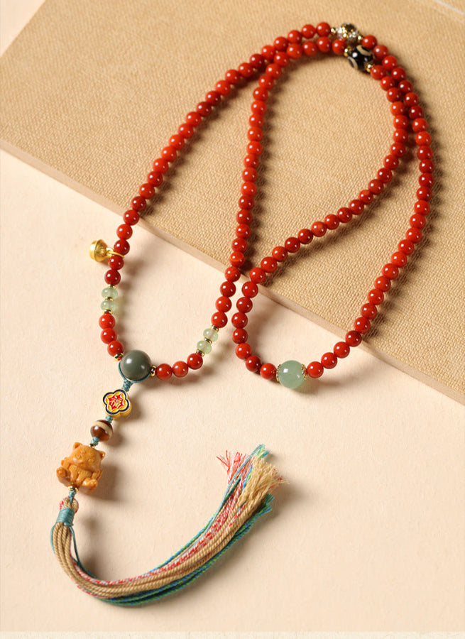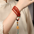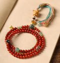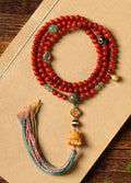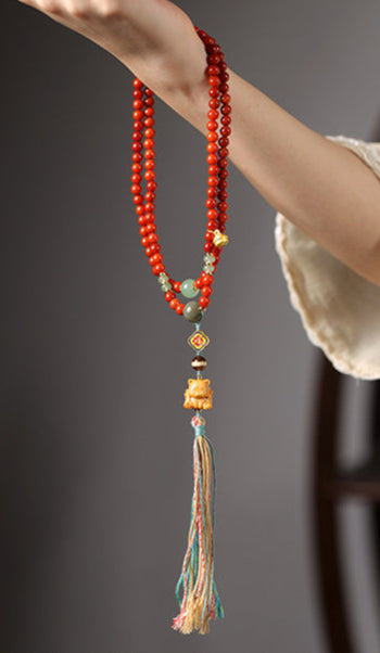 • Materials: Natural red agate & sandalwood & bodhi elements & green aventurine & dzi-style accent bead & Tibetan-silver findings & cloisonné enamel & durable cord