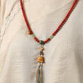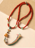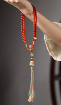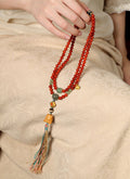 A luminous strand of ~108 red agate beads is hand-strung in a Tibetan-inspired design and finished with heritage accents for a calm, grounded presence. The warm crimson tone pairs with a mix of symbolic details—sandalwood, bodhi elements, green aventurine accents, a dzi-style bead, Tibetan-silver findings & cloisonné enamel—creating a refined mala that moves easily from daily meditation to statement styling. At approximately 72 cm in length, it can be worn long as a necklace or wrapped several times at the wrist. Red agate is traditionally appreciated for auspicious luck, heartfelt relationships & a steady, protective energy.