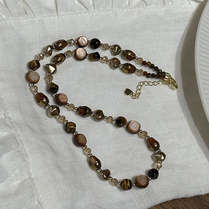 A warm, light-catching strand that pairs the silky chatoyance of natural tiger’s-eye with the soft luster of brown pearls. Subtle crystal accents and tiny spacer beads create an easy drape and gentle sparkle, while the gold-tone extender lets you fine-tune the length for tees, knits, or a clean neckline. Earthy, neutral, and quietly polished—made for everyday rotation and easy layering.