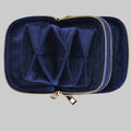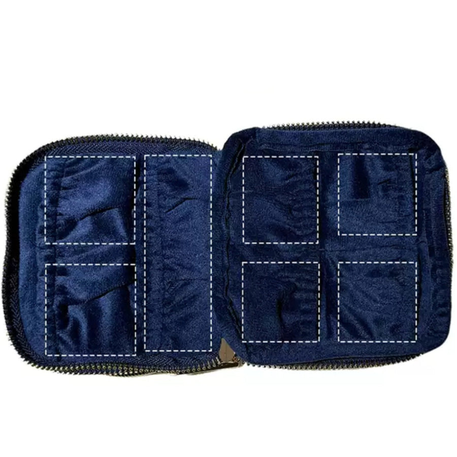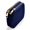 An elegant navy-blue jewelry case crafted in soft velvet, made for travelers who cherish quiet sophistication. Its double-layer structure neatly stores rings, necklaces, bracelets & earrings—each piece resting safely within a plush, protective interior. Finished with a smooth gold zipper & slender tassel, it reflects refined simplicity and serene beauty.
