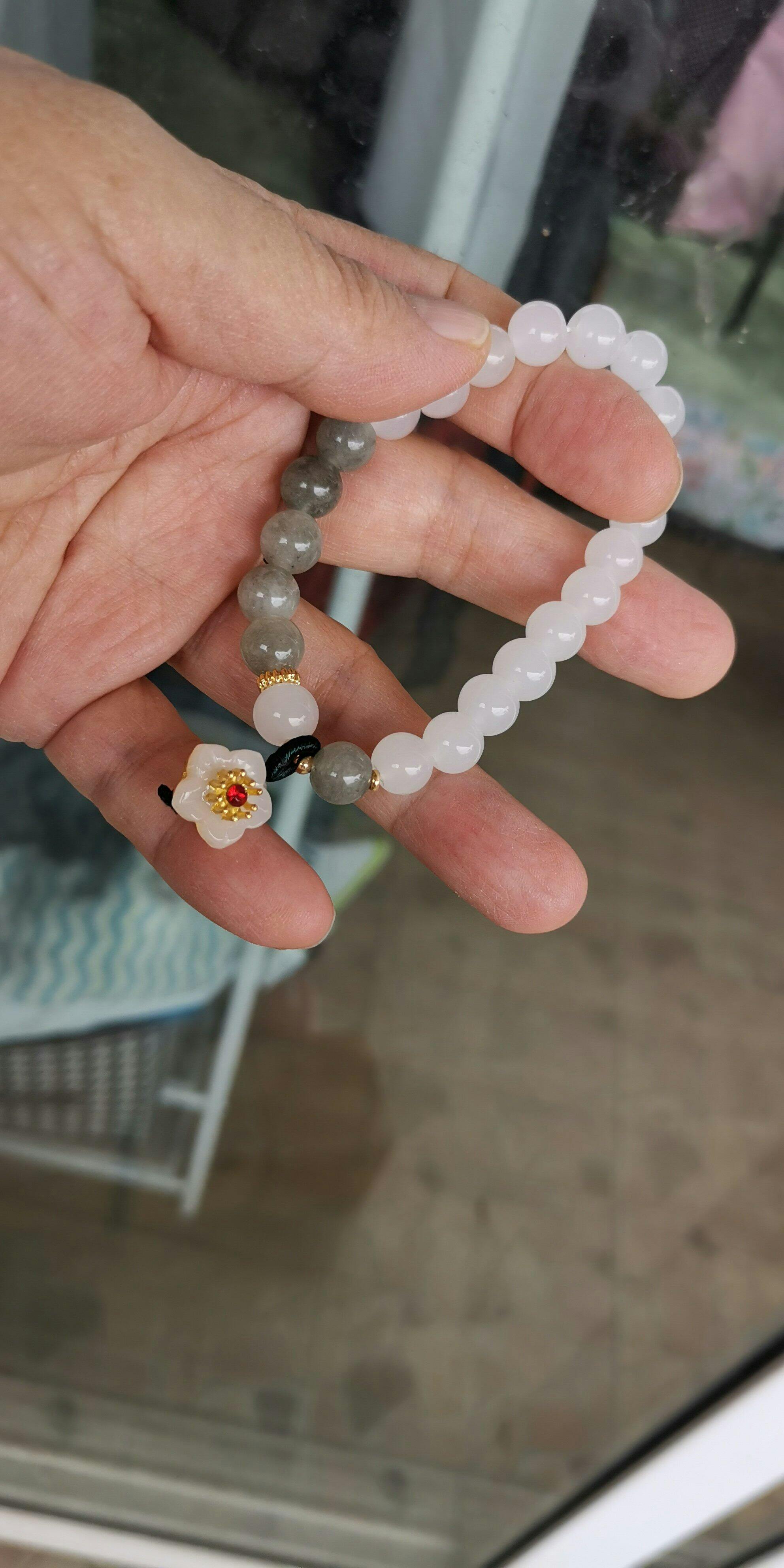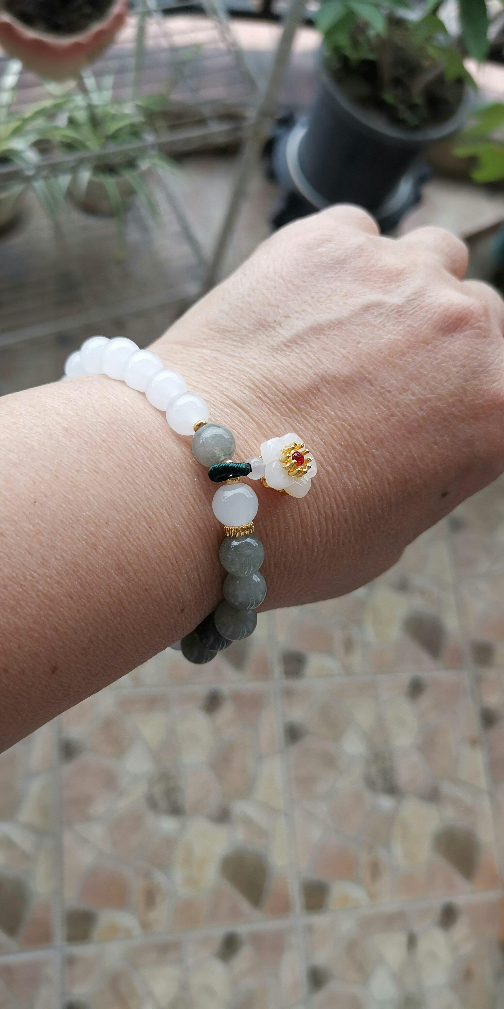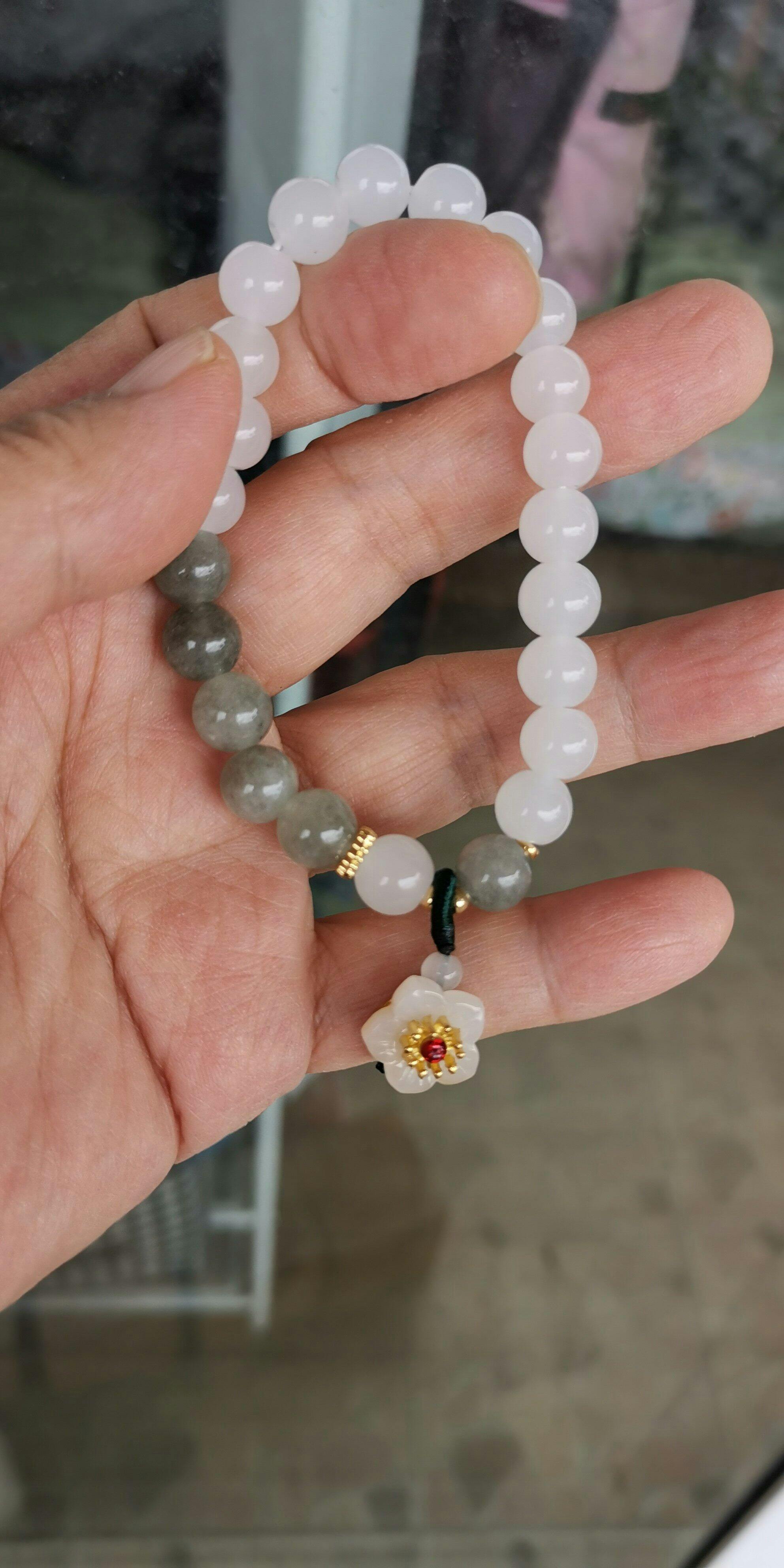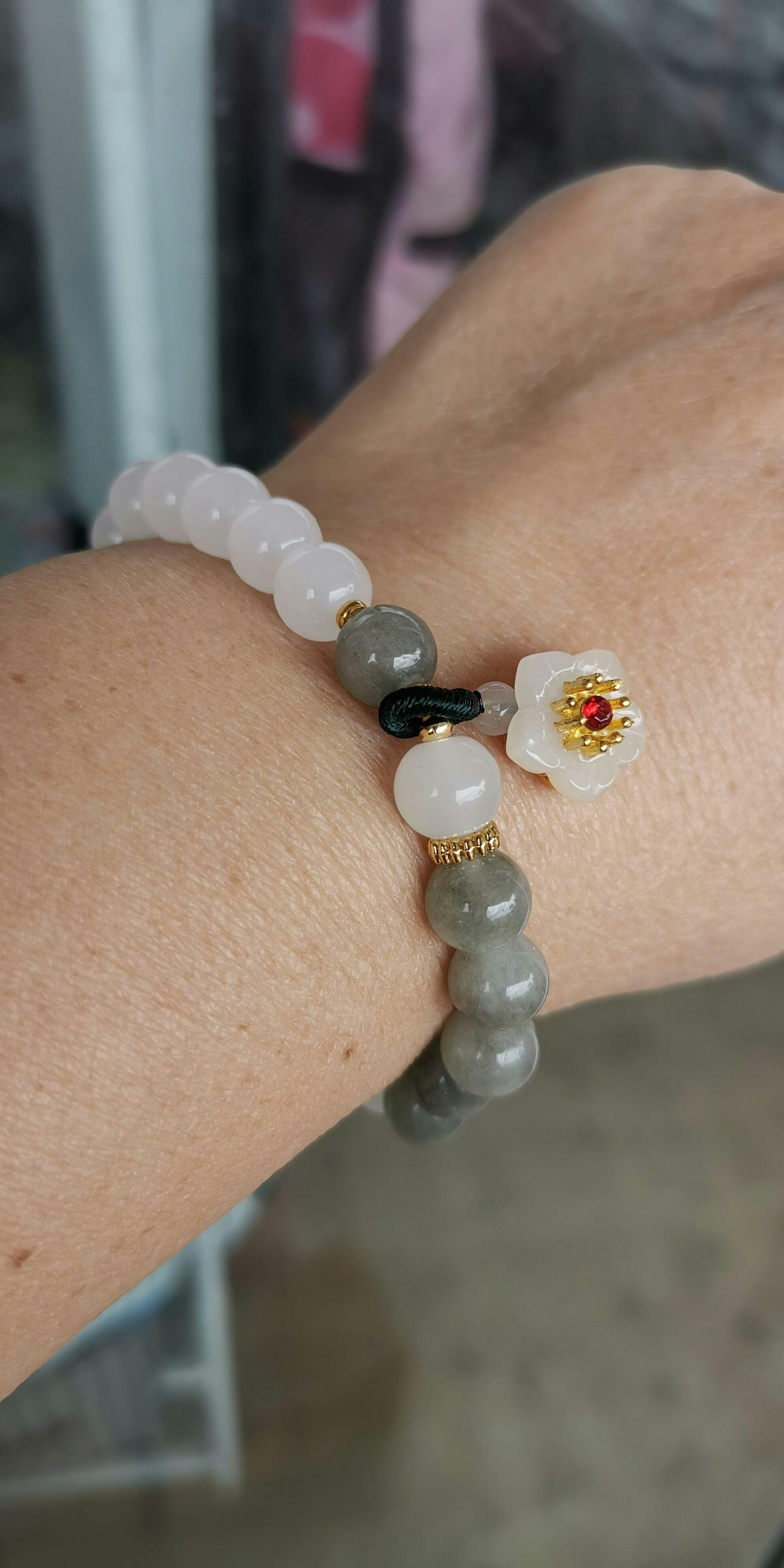 This bracelet combines luminous white jade beads with polished green aventurine, accented by golden spacers for refined detail. At its focal hangs a carved plum blossom charm, symbolizing resilience, beauty & renewal. Hand-strung on elastic, the bracelet offers both timeless elegance and spiritual meaning, making it a thoughtful talisman for women seeking harmony, grace & inner balance.