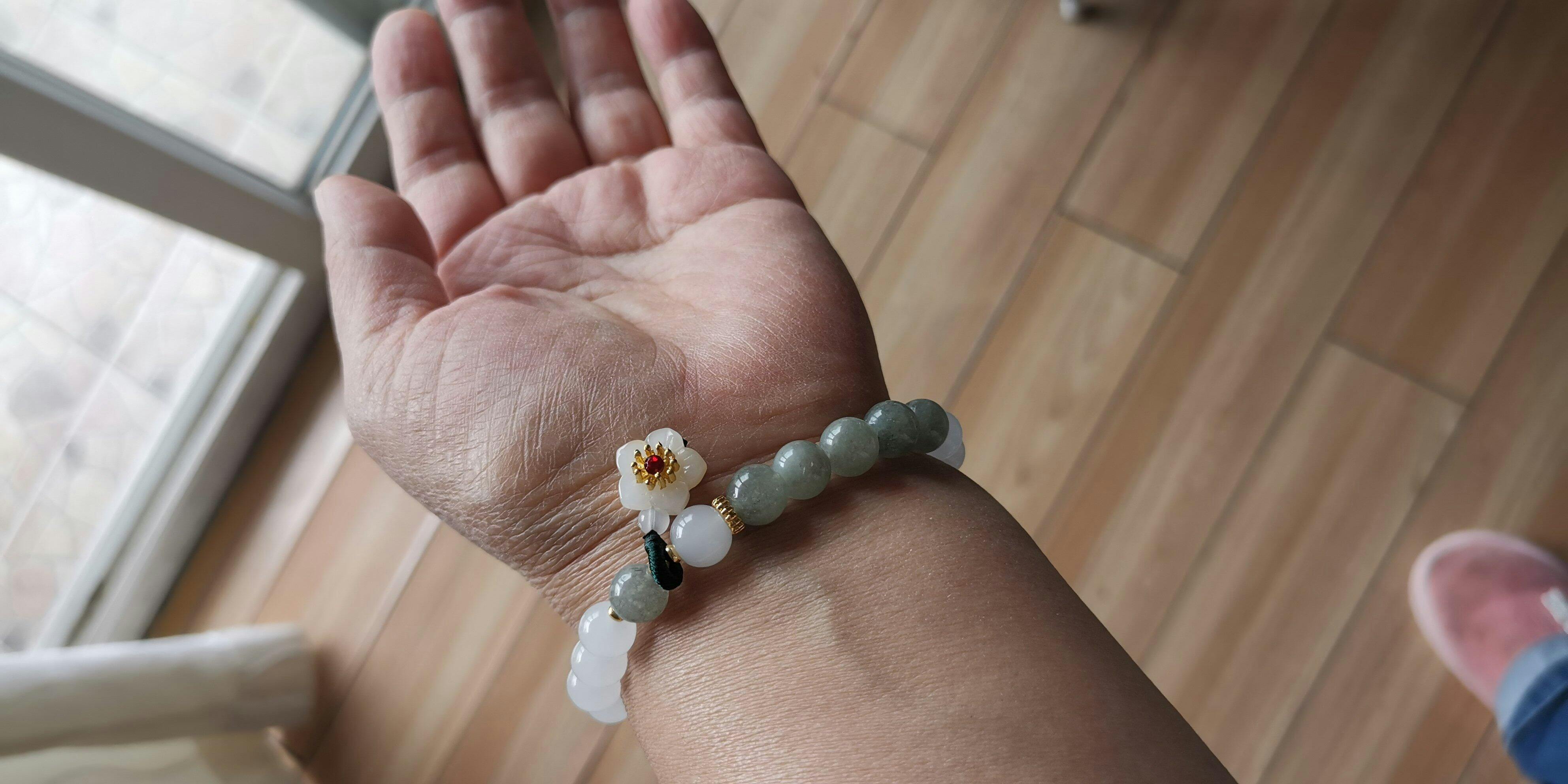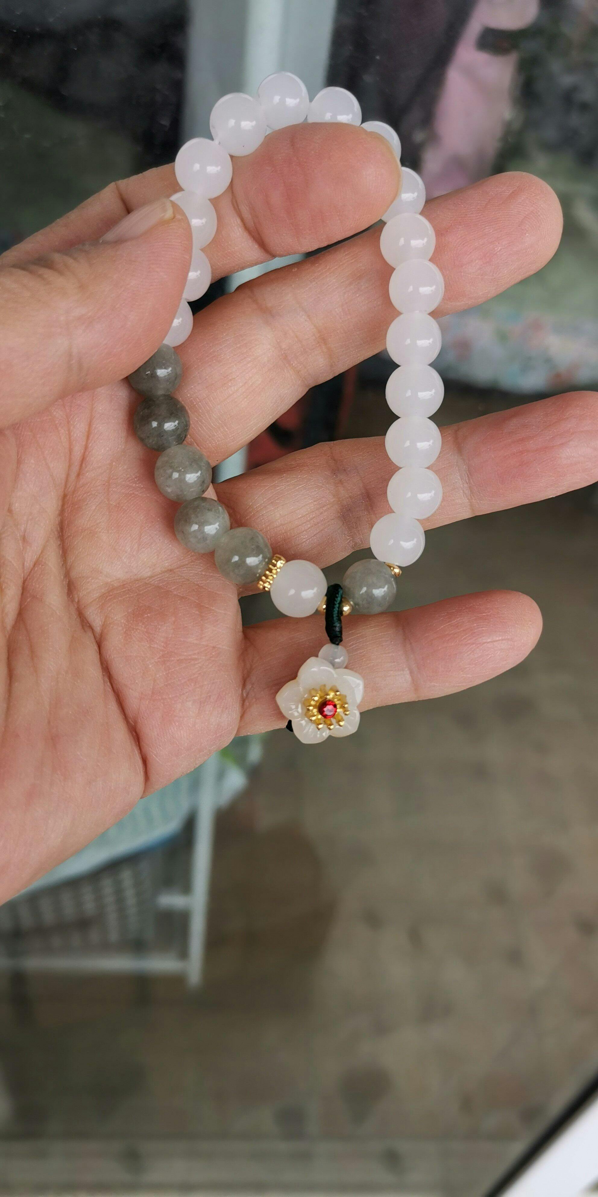 • Materials: White jade beads & green aventurine & carved stone flower pendant & gold-tone alloy spacers & elastic cord
